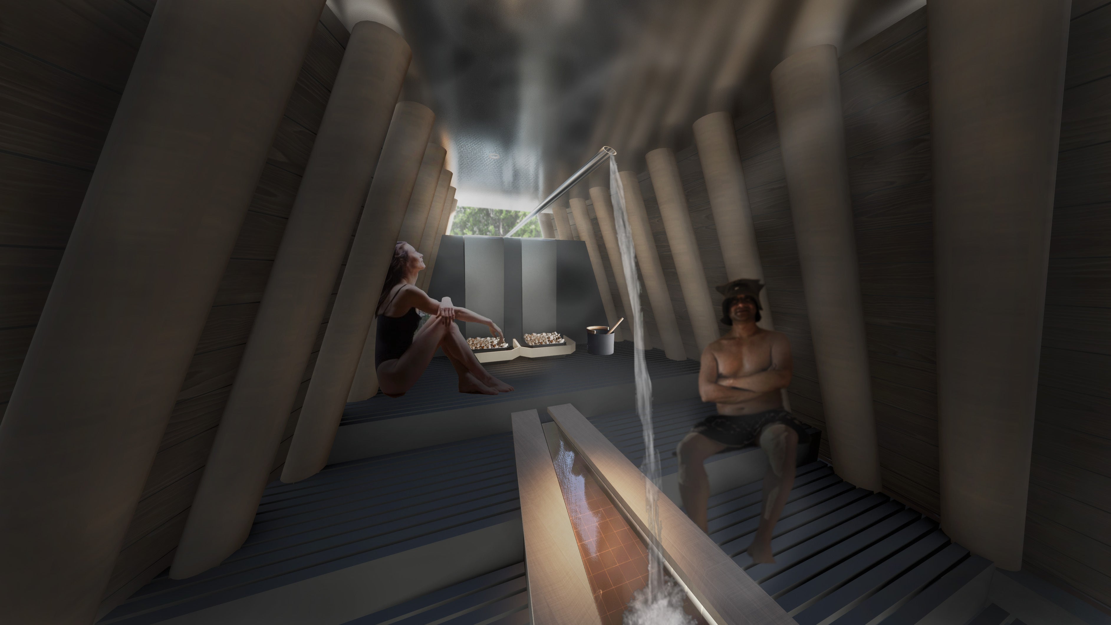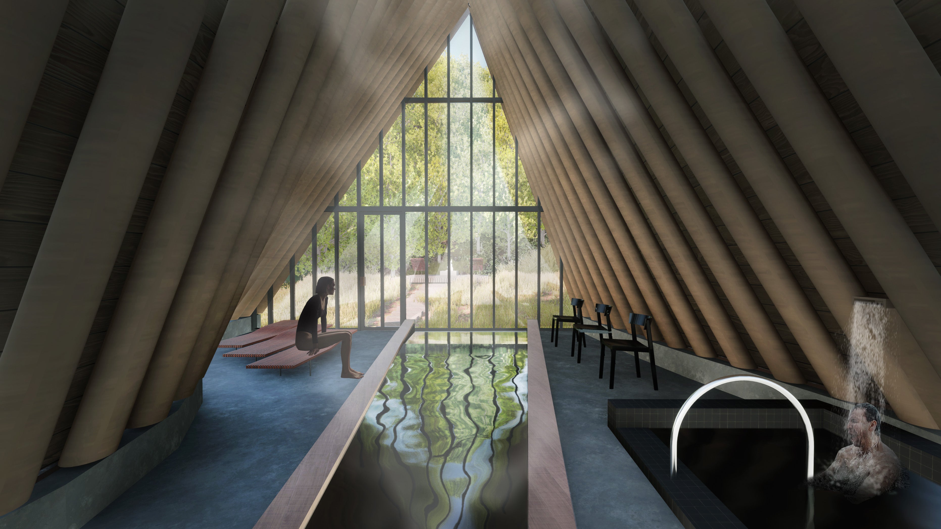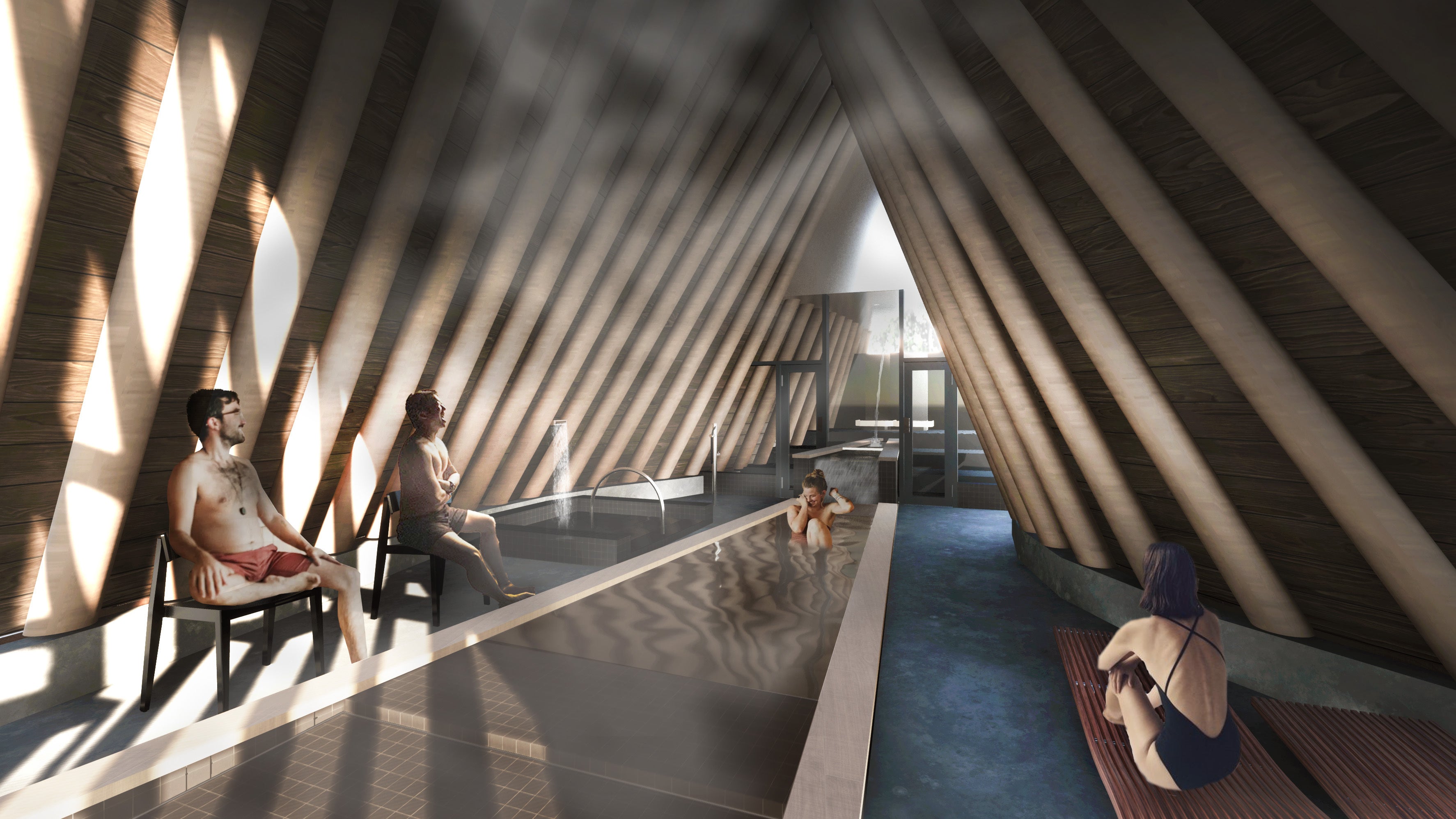 まず、北海道の厳しい自然に身を委ねる安心感を与えるために、洞窟のような単純で安定した構造が必要だと感じました。地元の道南スギの丸太を合掌型に組むというシンプルで安定した構造形式を採用することにしました。また、知内の豊かな温泉とサウナを有機的に融合させる機能性が不可欠だと考えました。源泉から引かれる温泉水はまずサウナ室に流れ込み、必要な熱と湿度を与えます。その後、汗を流すための掛け湯として機能し、やがて立ち湯に変わり、適度な熱を与える寝湯となって最後は、通路を融雪するための熱として利用され、自然の川に戻っていきます。熱という資源を無駄なく活用し、サウナ体験におけるストレスのない動線計画に力を注ぎました。