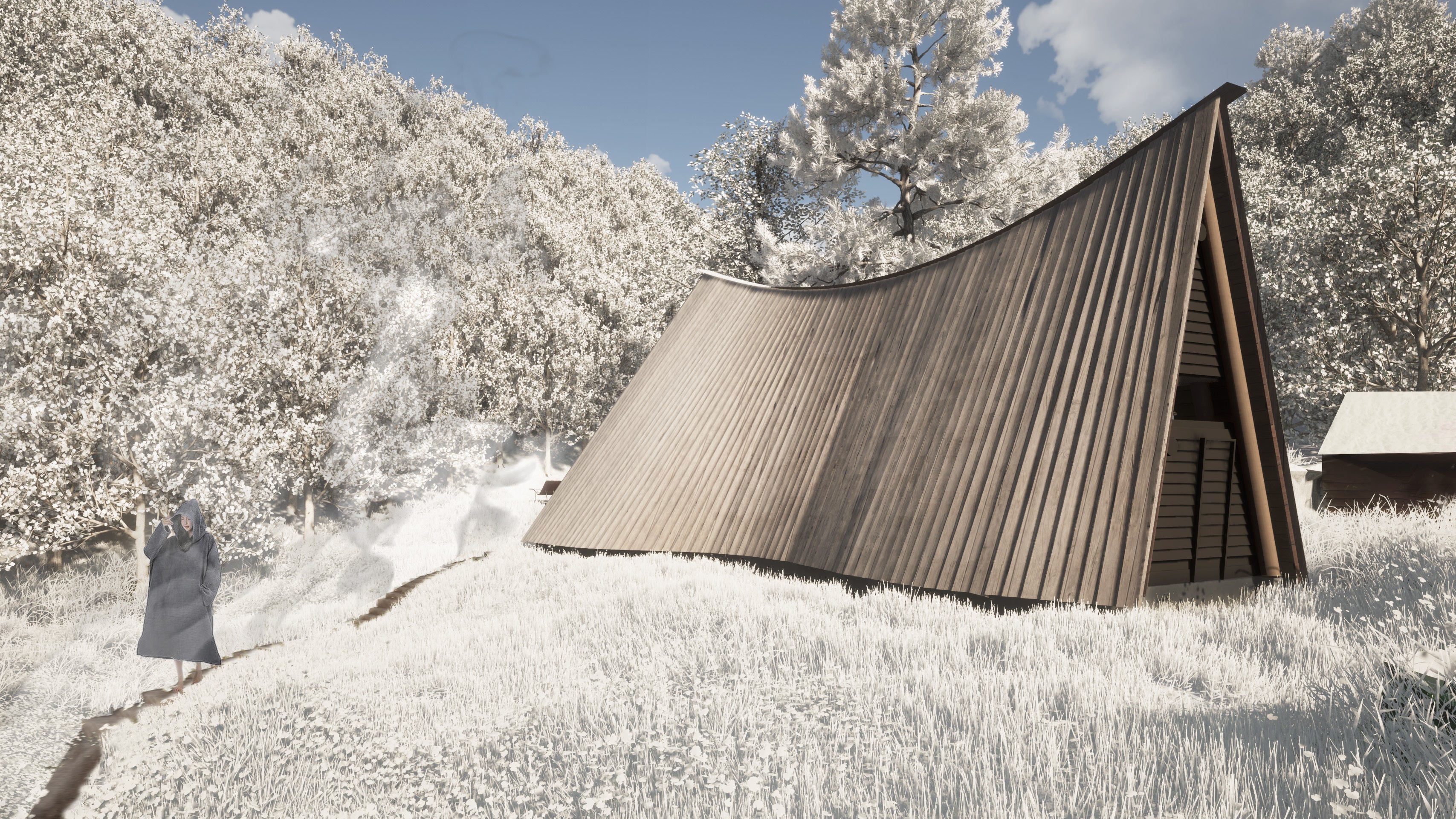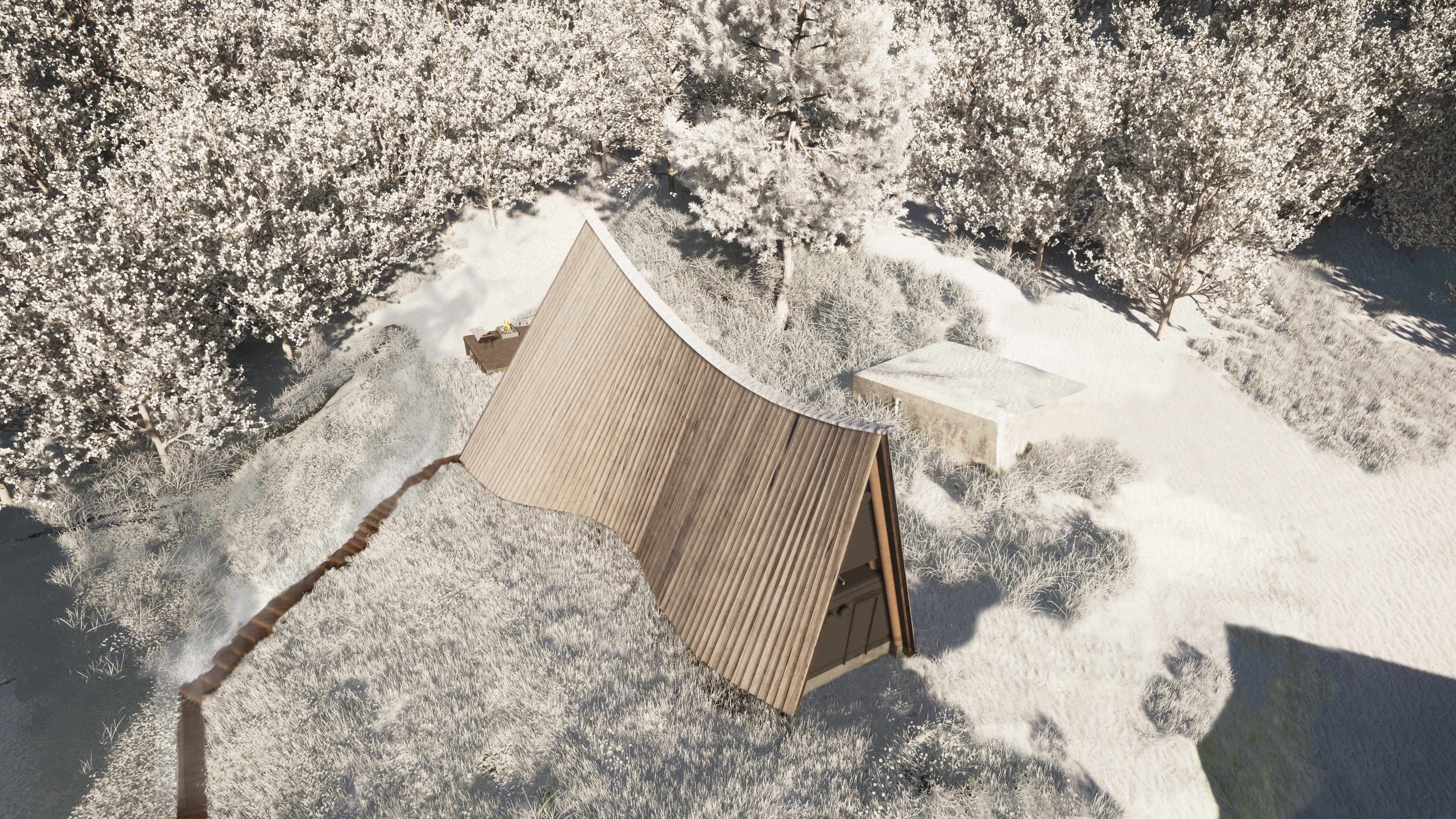 まず、北海道の厳しい自然に身を委ねる安心感を与えるために、洞窟のような単純で安定した構造が必要だと感じました。地元の道南スギの丸太を合掌型に組むというシンプルで安定した構造形式を採用することにしました。また、知内の豊かな温泉とサウナを有機的に融合させる機能性が不可欠だと考えました。源泉から引かれる温泉水はまずサウナ室に流れ込み、必要な熱と湿度を与えます。その後、汗を流すための掛け湯として機能し、やがて立ち湯に変わり、適度な熱を与える寝湯となって最後は、通路を融雪するための熱として利用され、自然の川に戻っていきます。熱という資源を無駄なく活用し、サウナ体験におけるストレスのない動線計画に力を注ぎました。