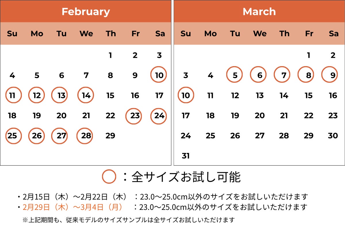 ・2月29日(木)~3月4日(月) :23.0~25.0cm以外のサイズをお試しいただけます