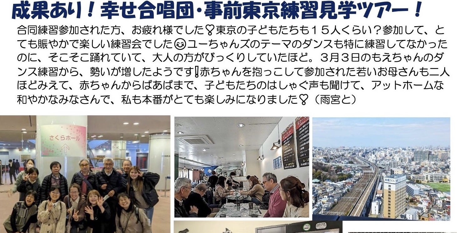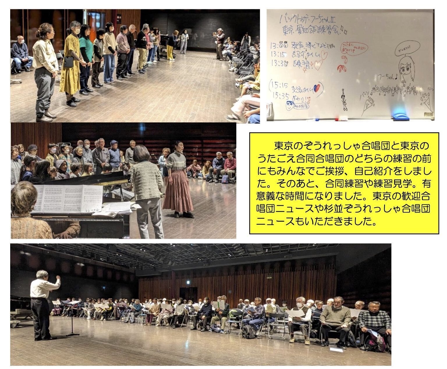 3月20日(祝)、東京・港区の男女共同参画センター「リーブラ」で、愛知子どもの幸せと平和を願う合唱団17人と演出家・西尾栄儀さんを迎えて、東京のぞうれっしゃ合同合唱団の「バックトゥザ・フーちゃんⅡ」の合同練習がおこなわれました。