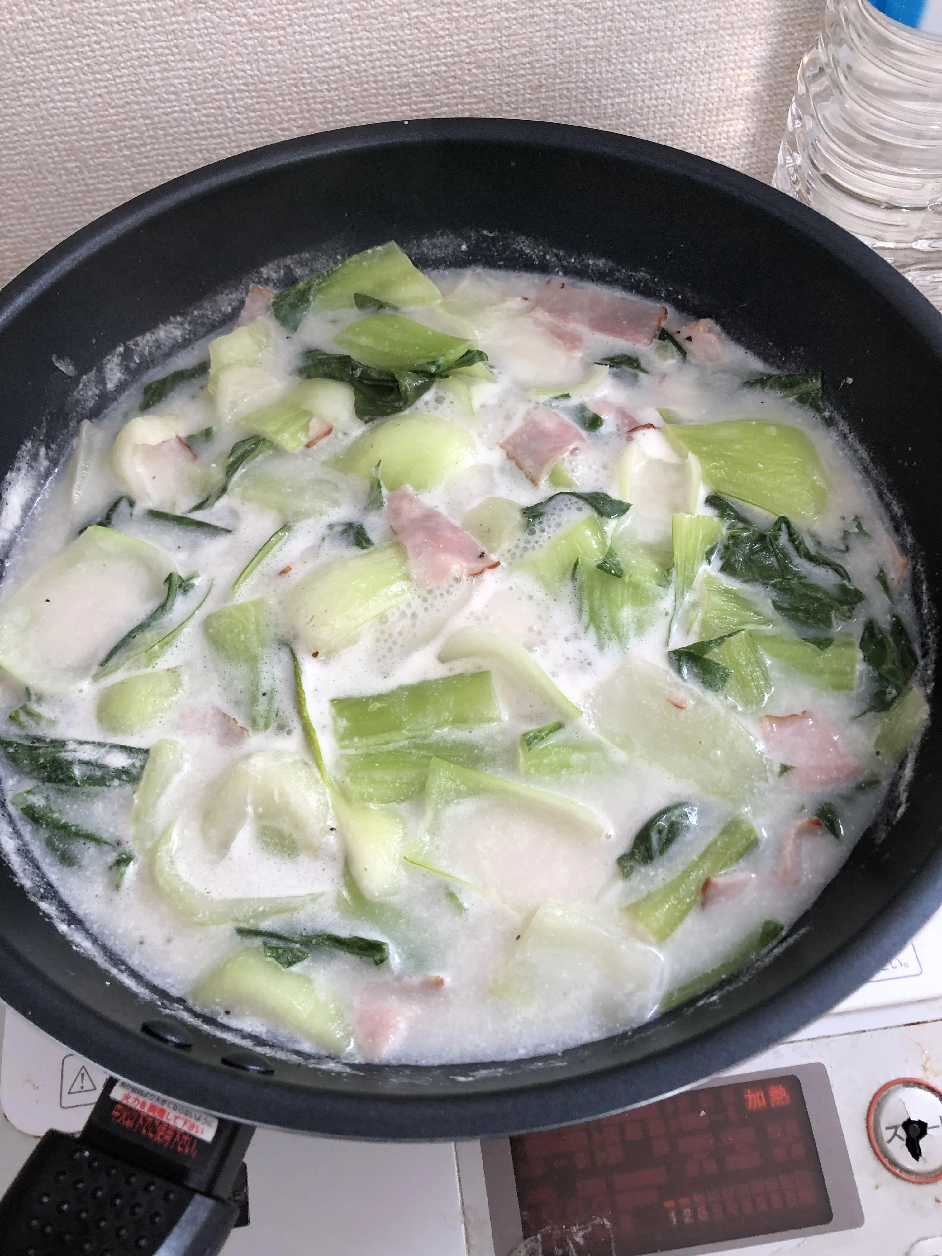 シャキシャキした青梗菜とベーコンを炒めて、牛乳と塩コショウ、ブイヨンをちょっと入れて作りました。