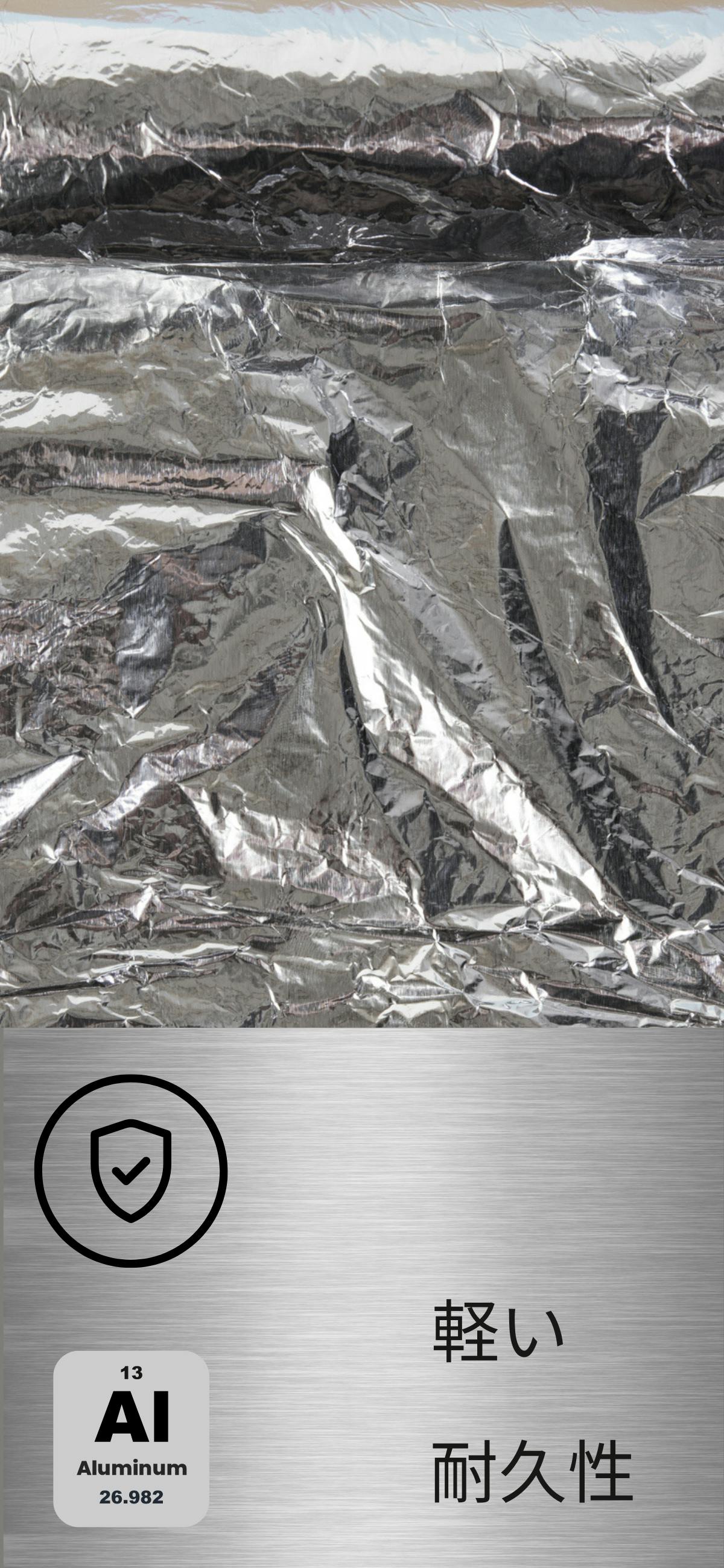 アルミニウム素材が体温を反射し発熱性を発揮し「超温環境」に保つ。さらにアルミニウムコーティングにより、