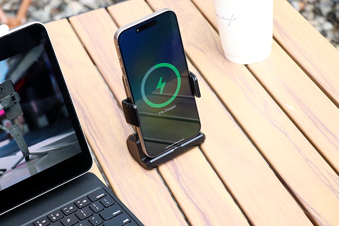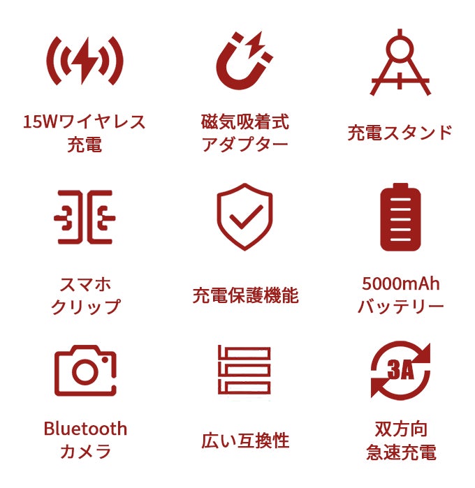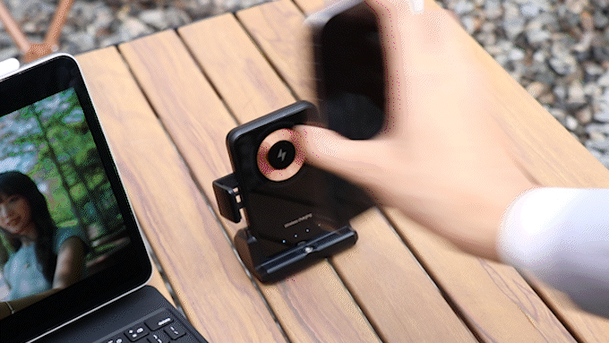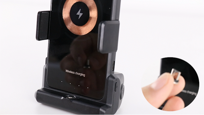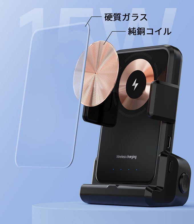15Wのワイヤレス急速充電も提供しており、Bluetoothワイヤレス接続で、スマホを充電しながら、撮影/録画することも可能!また、付属の磁気吸着式アダプター2個で、ワイヤレス充電機能のないスマホでも対応可能!