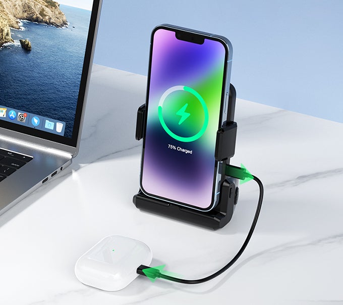 「YRBank」はスマホホルダー設計を採用しており、スマホを製品に置いて、両方のホルダーでスマホを真ん中につまむだけでスマホを固定できます。