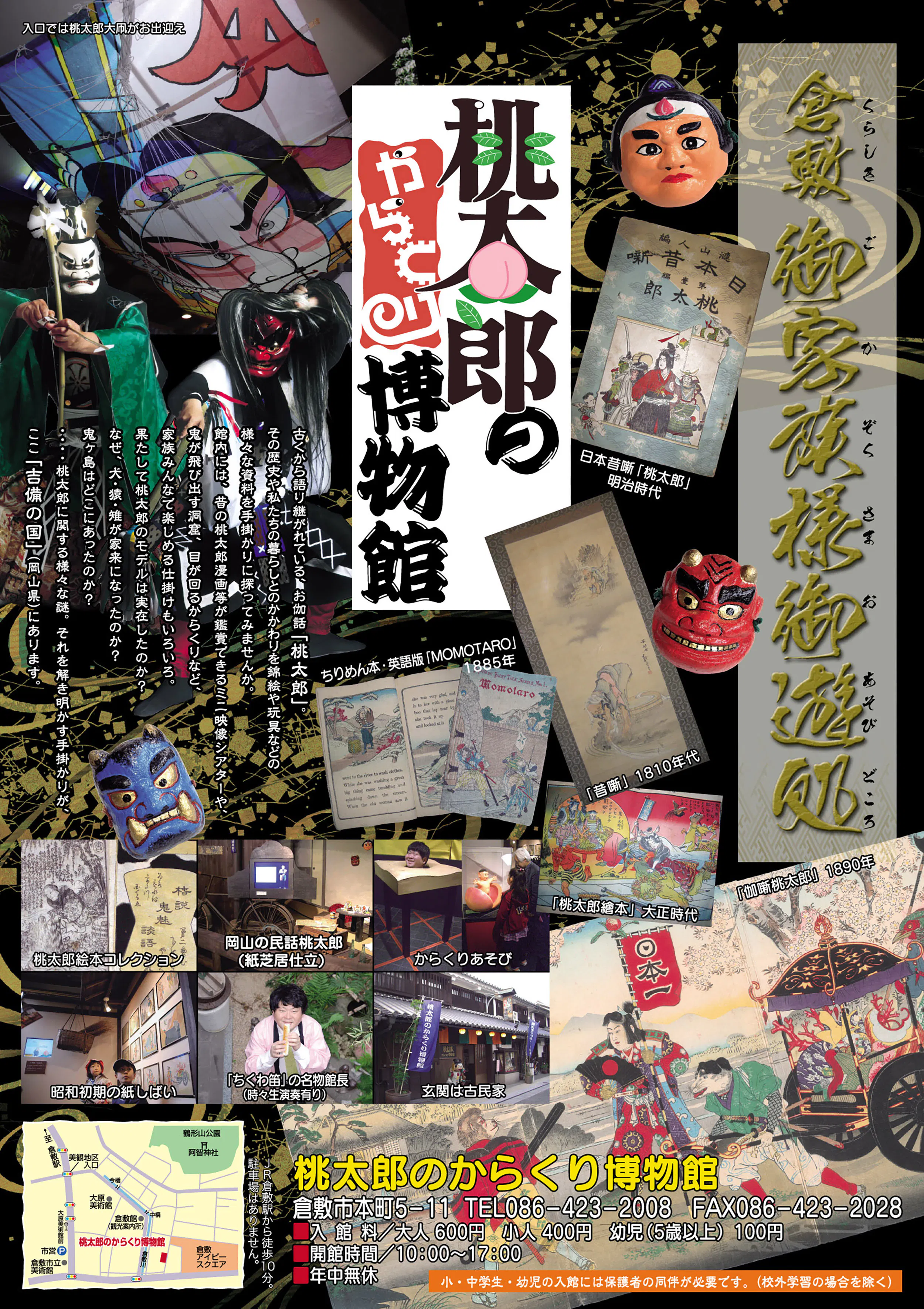 私たちが運営する『桃太郎のからくり博物館』は岡山県倉敷市の美観地区にある、桃太郎の歴史資料(古文献、絵本、玩具、浮世絵等)や、工夫を凝らしたからくり展示物、洞窟探検「鬼ヶ島」などの体感型アトラクションも備えた博物館、テーマパークになります!