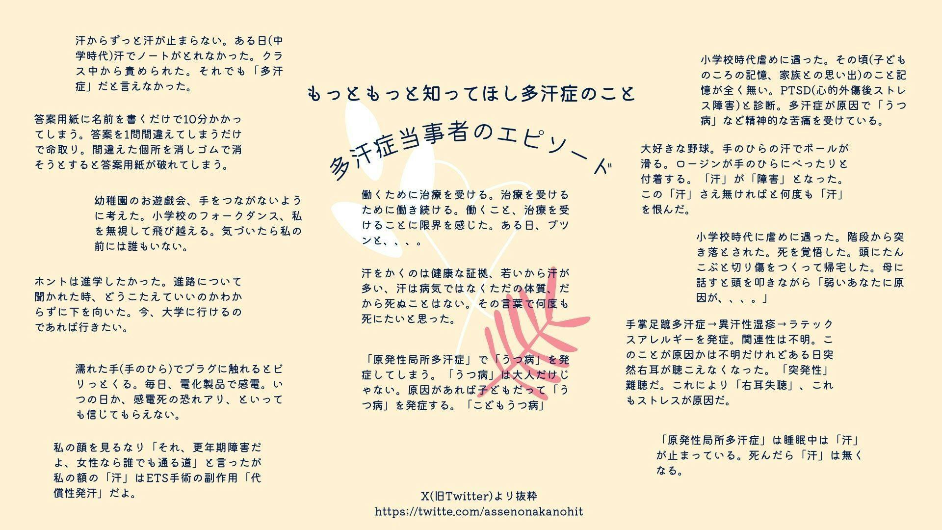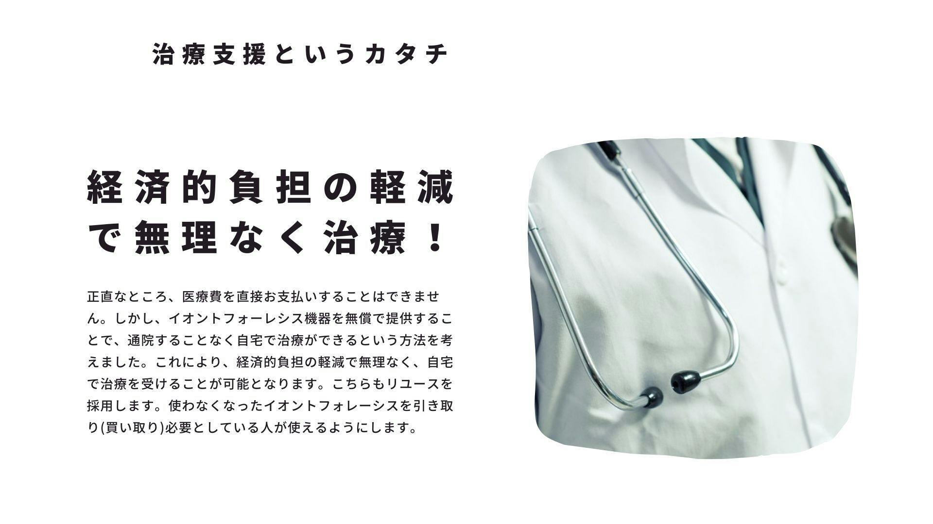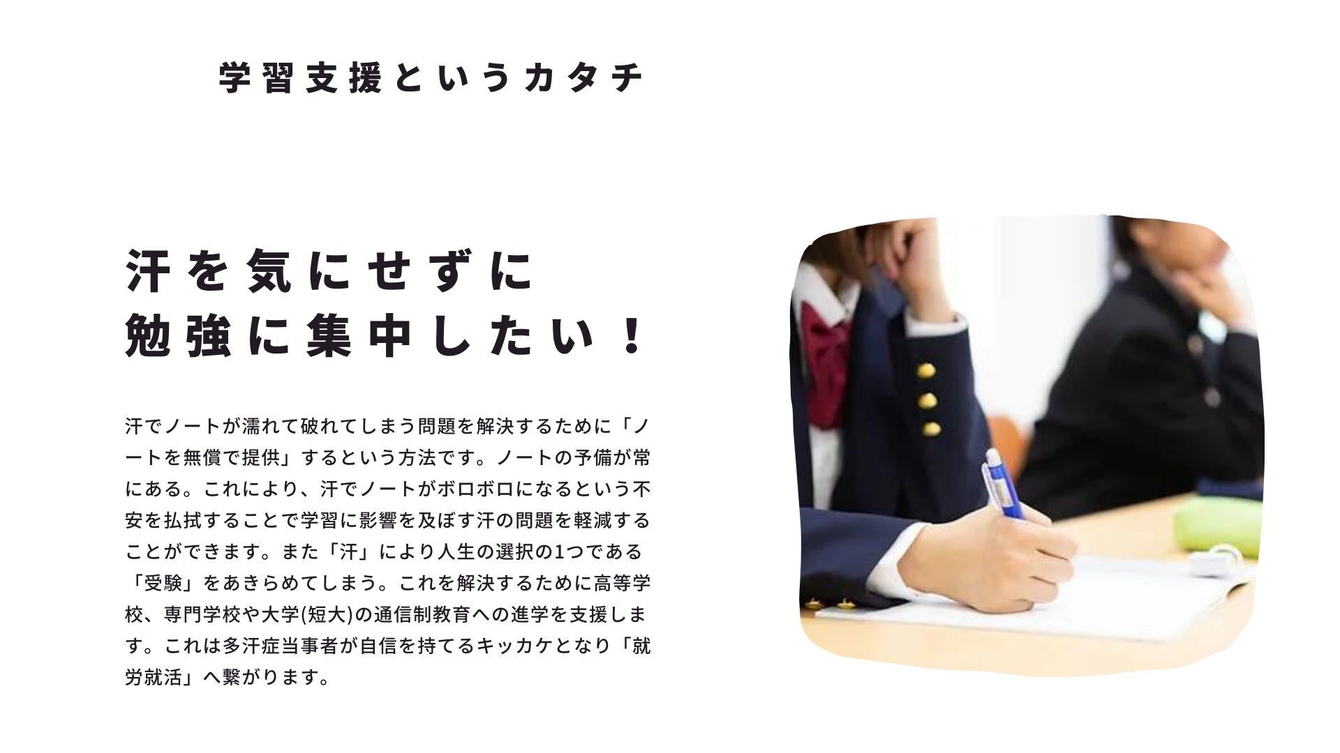 「多汗症」は、「難病」や「障害者」には該当しない疾患ですが、多量の汗がさまざまな問題を引き起こすことがあります。通常、難病や障害者であれば、社会的な支援を受けることができる場合がありますが、「多汗症」にはそのような支援がほとんど存在しません。そこで、「あったらいいなぁ」と思うことを、具体的な「支援」のカタチに変えることが大切だと考えました。
