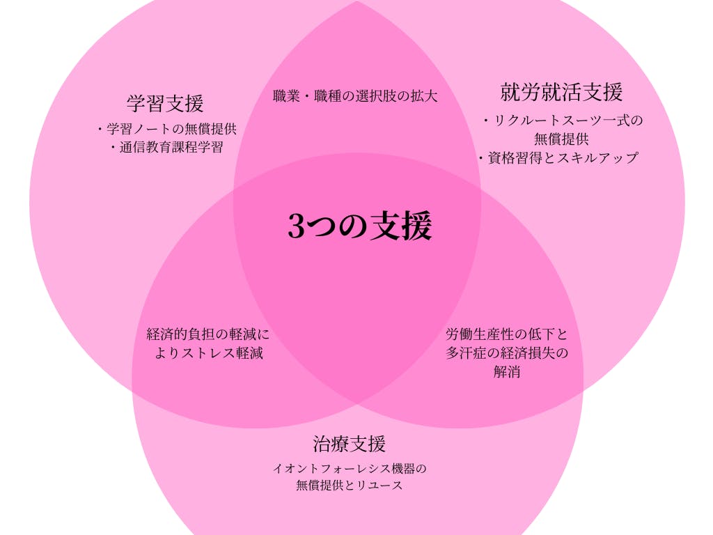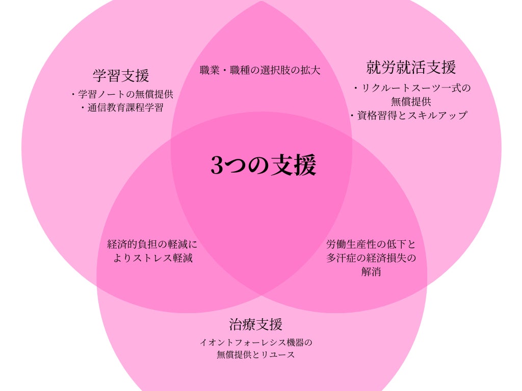 「学習・治療・就労(就活)支援」です。「3つの支援」とは、多汗症に苦しむ当事者が、汗による困難から解放され、自由に活動し、学び、働くことができる生活を実現するための支援のカタチです。これにより、QOL(生活の質)が向上し、多汗症の当事者がより良い生活を送ることが可能になります。