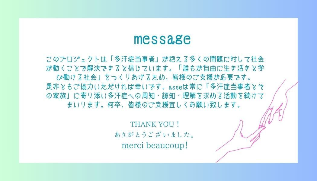 多くの多汗症当事者が抱えてきた問題を振り返ると、これらは社会全体で考慮すべき重要な課題であることに気づきました。問題があればそれらを解決しなければなりません。それは国や行政では成し遂げられないことも、私たち「多汗症当事者」だからこそ出来る!必ず解決策があると信じています。