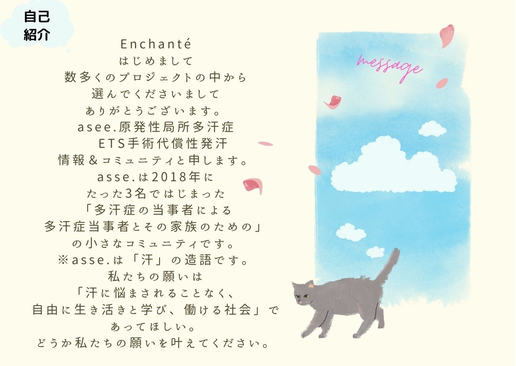 幼少期に発症し大人になっても治ることなく悩み続ける「多汗症」は時に「障害」となり、日々の生活はもちろんのこと仕事や勉強に大きな影響を与えてしまいます。例えば、学校では「汗」が気になり集中力が欠けてしまったり、虐めの対象になることもあります。また「仕事・職種」の選択肢が限られ、失業の恐れを抱きながら日々を送っています。しかし、「あったらいいなぁ」と思うものを具体的な形にすることができれば、状況は変わります。この取り組みは、私たち多汗症当事者の生活の質を向上させ、より良い未来を創造するための一歩となることを信じています。そこで私たちは「支援」というカタチを選択したのです。
