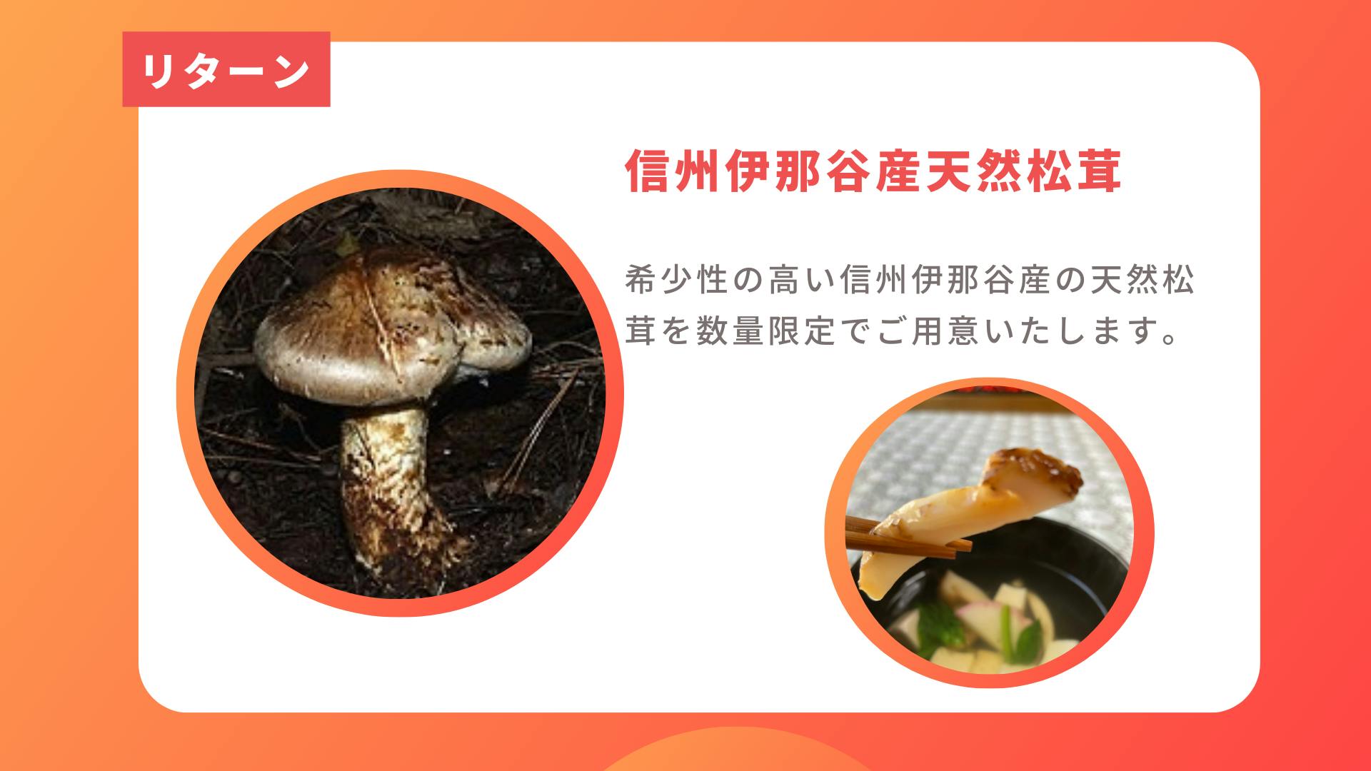 お礼の品につきましては地元農家の駒ヶ根産ブルーベリーと岩見農園のシャキパリッと歯応えと旨みの広がるきゅうりや同じ自然由来の肥料で育てています季節に応じたお野菜、岩見農園での収穫体験、バーベキュー体験等様々なお返しを案内します。 駒ヶ根市は魅力的な部分がたくさんあります!クラファン投稿後も魅力的なリターンをご用意できましたらご用意いたします。活動報告もできるだけたくさん報告し、支援につながっていただければ幸いです。信州伊那谷産の希少価値の高い天然松茸を数量限定でご用意させていただきます。