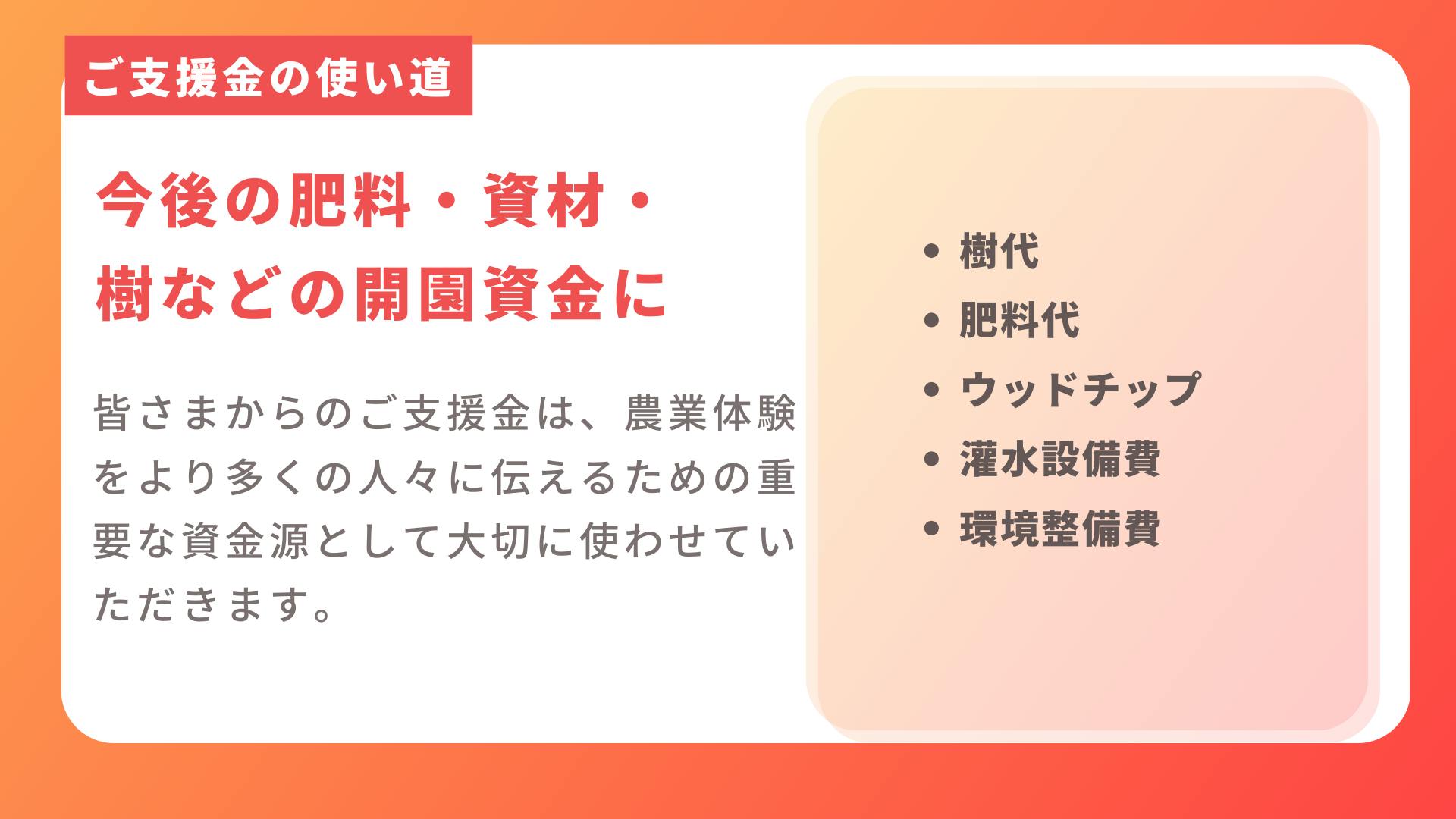 これまでに土地の購入資金、農地の整備造成工事費用など自分のできることは実行し、金融機関にも相談にいきましたがこれ以上は自分の力だけでは実行できなくなりクラウドファンディングを行う決意をいたしました。