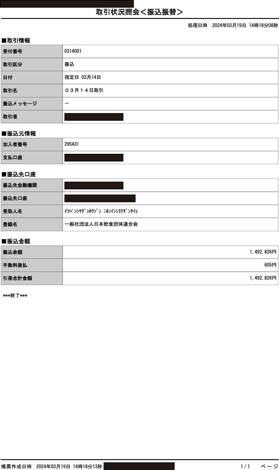 3月中旬頃 日本飲食団体連合会(食団連)様へ送金