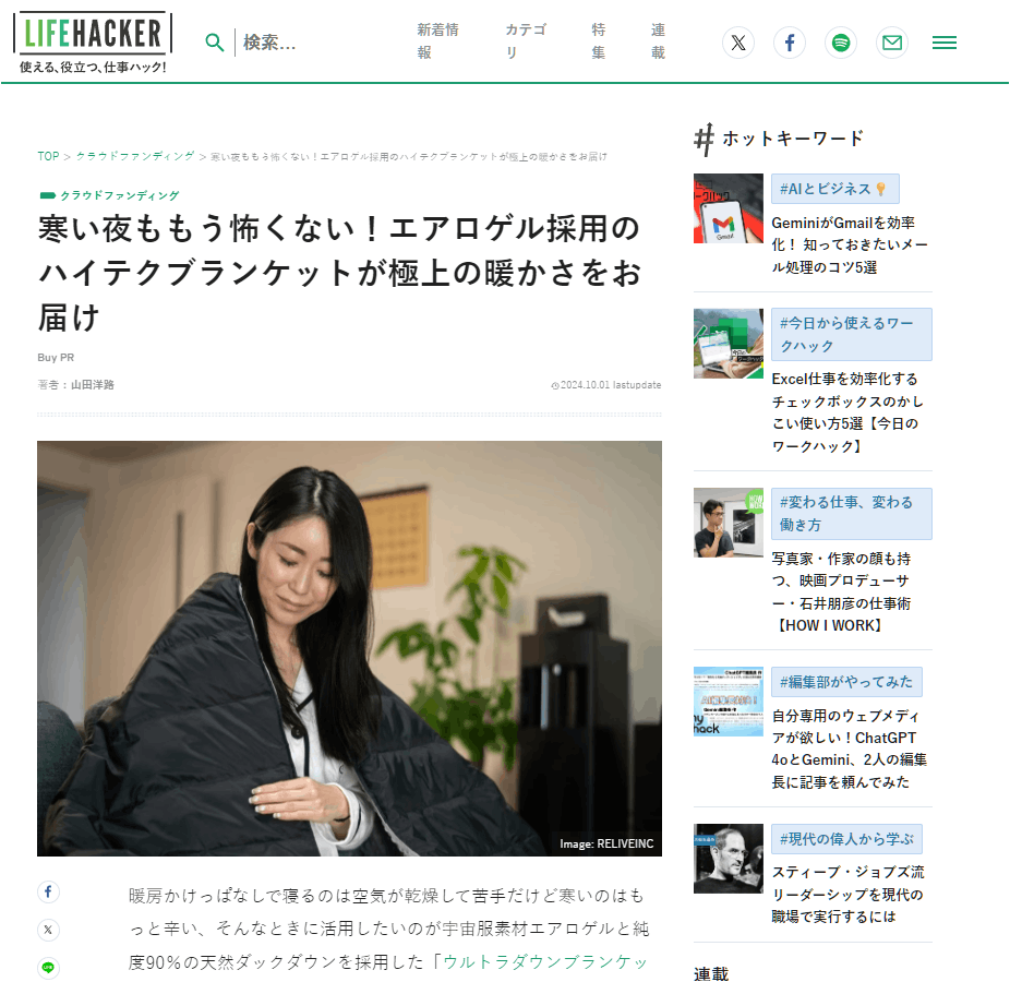 「寒い夜ももう怖くない!エアロゲル採用のハイテクブランケットが極上の暖かさをお届け」(ライフハッカージャパン)