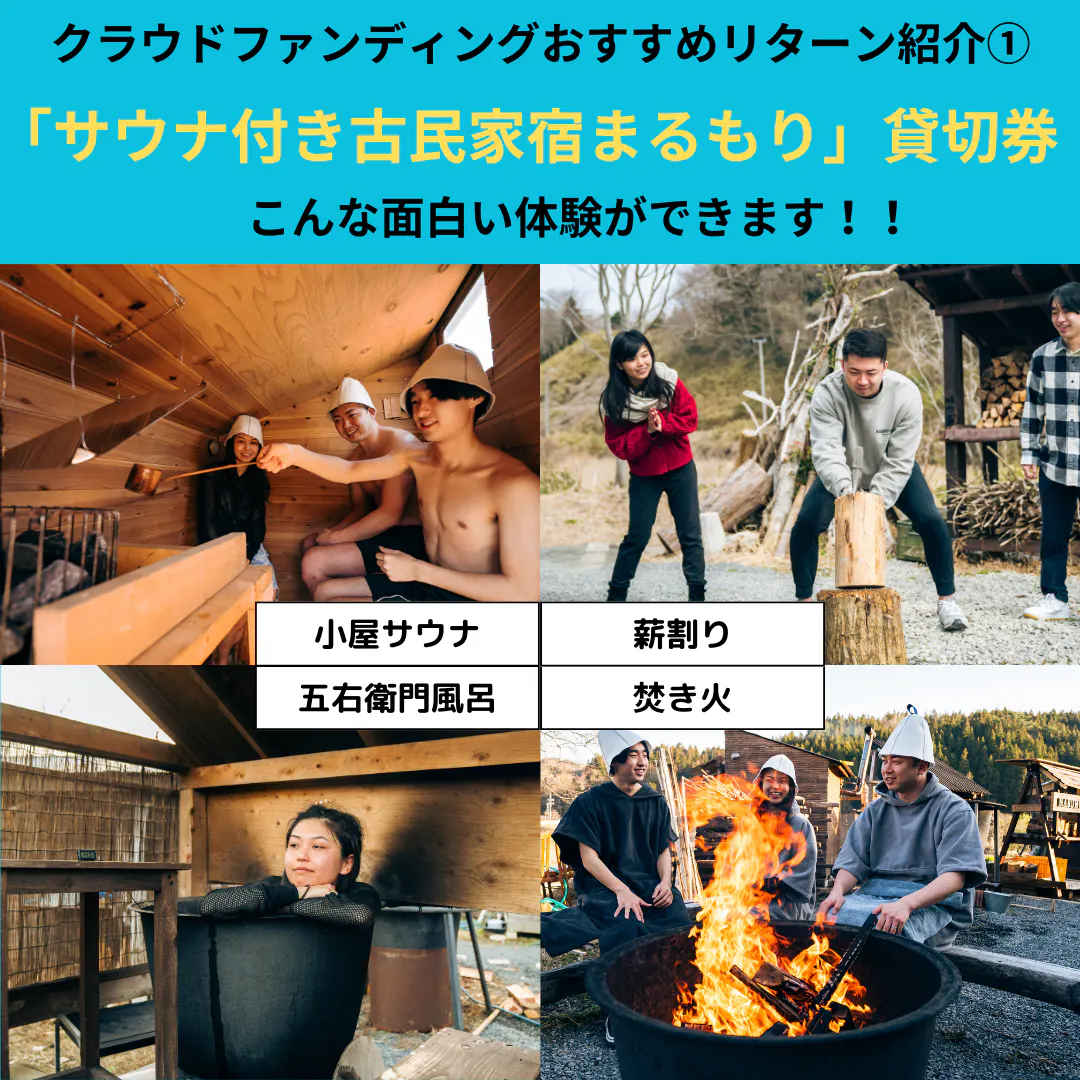 「サウナ付き古民家宿まるもり」では、サウナや五右衛門風呂、薪割り、焚き火などこの宿でしか味わえない体験をすることができます。サウナ付き古民家宿まるもりで体験できる事①小屋サウナ(ひっぽの桑茶と漢方を配合したサウナアロマを開発中)②五右衛門風呂(スタッフと一緒に火おこしから行えます。)③薪割り体験(小学生くらいの子供からできます。)④焚き火(桑の木を切って薪を作る所からお願いします。)