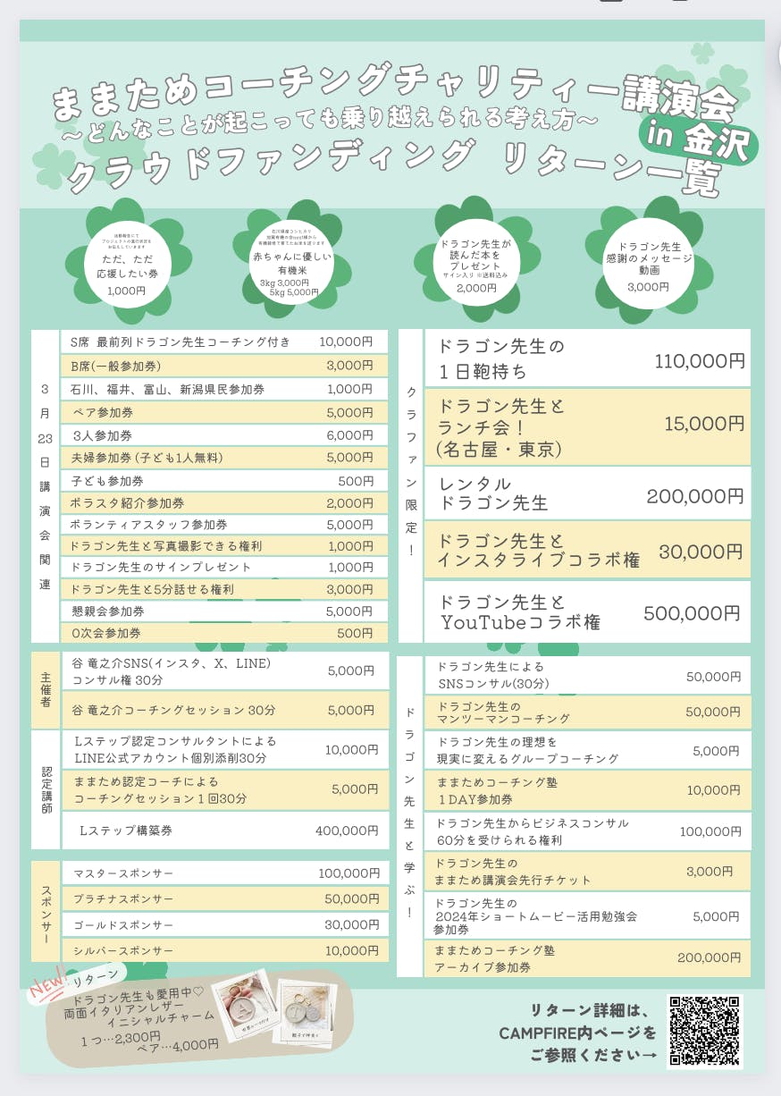 2024/09/05 09:41ご支援いただいた皆様へ。この度は能登半島地震のクラウドファンディングにご支援いただきありがとうございました。長らくお待たせしましたが、支援先と支援金の使用用途が決定したのでお知らせします。その前にまず、クラファンの支援について集まった支援金1805900円経費699174円でした。使える支援金1186726円になります。支援先カタリバさん 10万円ガイア復興支援プロジェクトさん 50万円(珠洲市の子ども向けイベント主催)珠洲市 40万円 学校教室用大型テレビ輪島市 20万円(残金+@)給食用食器こちらで支援することになりました。輪島市9/24珠洲市10/31にドラゴン先生と目録の贈呈に訪問します。また各支援先の様子や訪問した際に活動報告できればと思いますので、宜しくお願いします。株式会社CーTrust谷竜之介 もっと見る講演会会場変更について