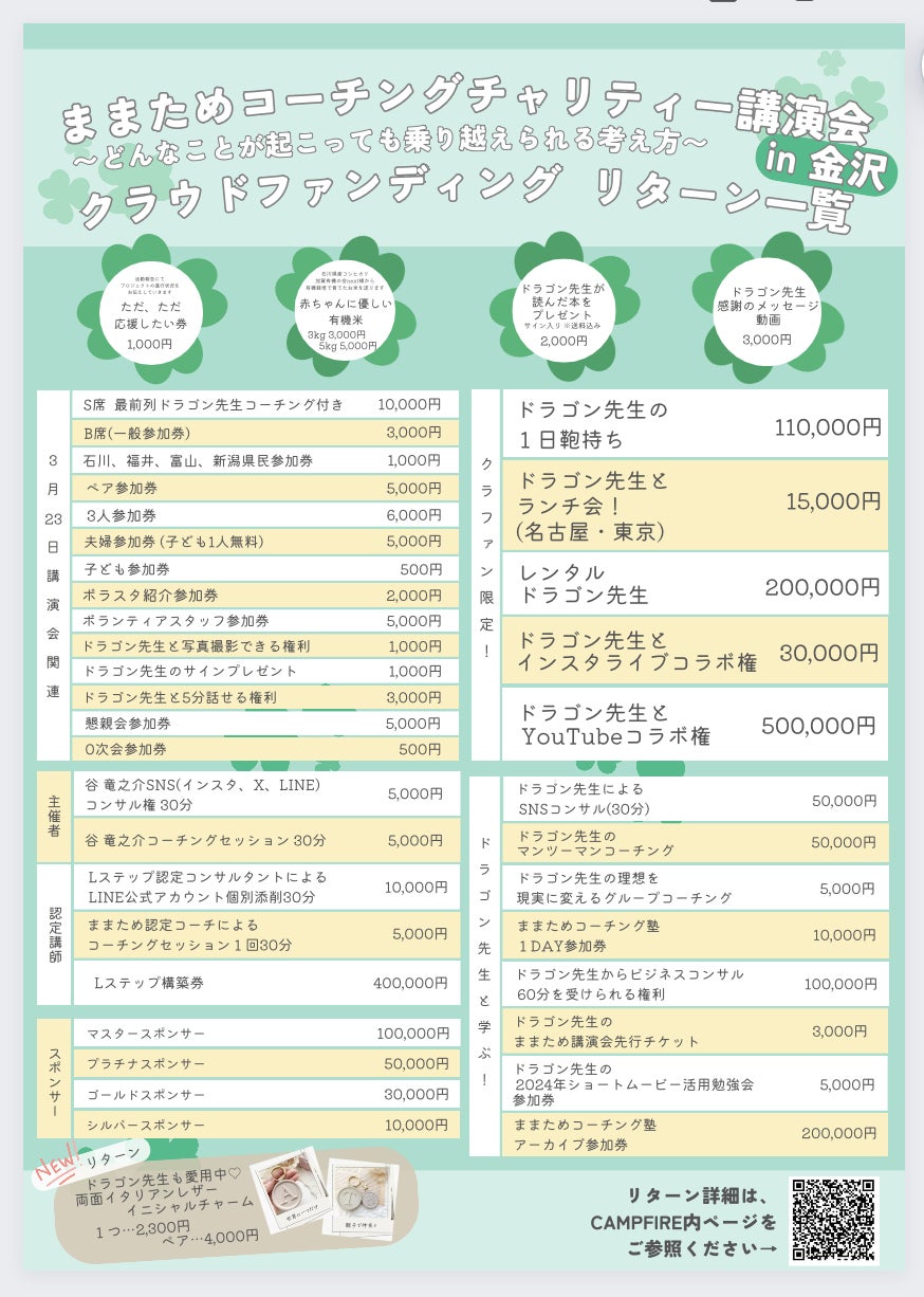 2024/09/05 09:41ご支援いただいた皆様へ。この度は能登半島地震のクラウドファンディングにご支援いただきありがとうございました。長らくお待たせしましたが、支援先と支援金の使用用途が決定したのでお知らせします。その前にまず、クラファンの支援について集まった支援金1805900円経費699174円でした。使える支援金1186726円になります。支援先カタリバさん 10万円ガイア復興支援プロジェクトさん 50万円(珠洲市の子ども向けイベント主催)珠洲市 40万円 学校教室用大型テレビ輪島市 20万円(残金+@)給食用食器こちらで支援することになりました。輪島市9/24珠洲市10/31にドラゴン先生と目録の贈呈に訪問します。また各支援先の様子や訪問した際に活動報告できればと思いますので、宜しくお願いします。株式会社CーTrust谷竜之介 もっと見る講演会会場変更について