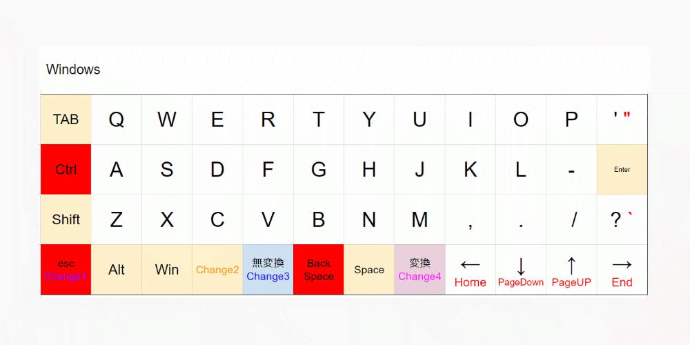 【無変換】【change3】、【変換】【change4】は同じキーであり、長押しすると【change3】【change4】キーとして機能し、クリックすると【無変換】【変換】キーとして機能します。これによりwindowsの設定で無変換をIME-OFF、変換をIME-ONに設定することで、MacOSのような挙動でタイピングする事が可能です