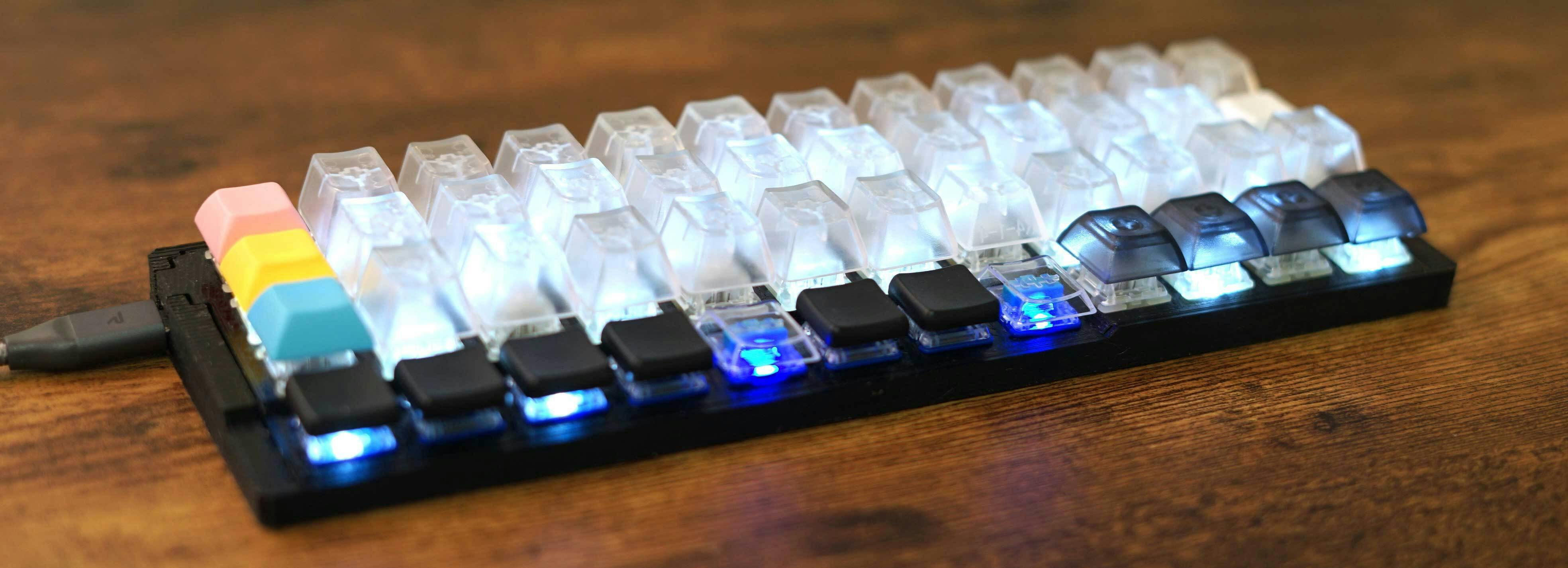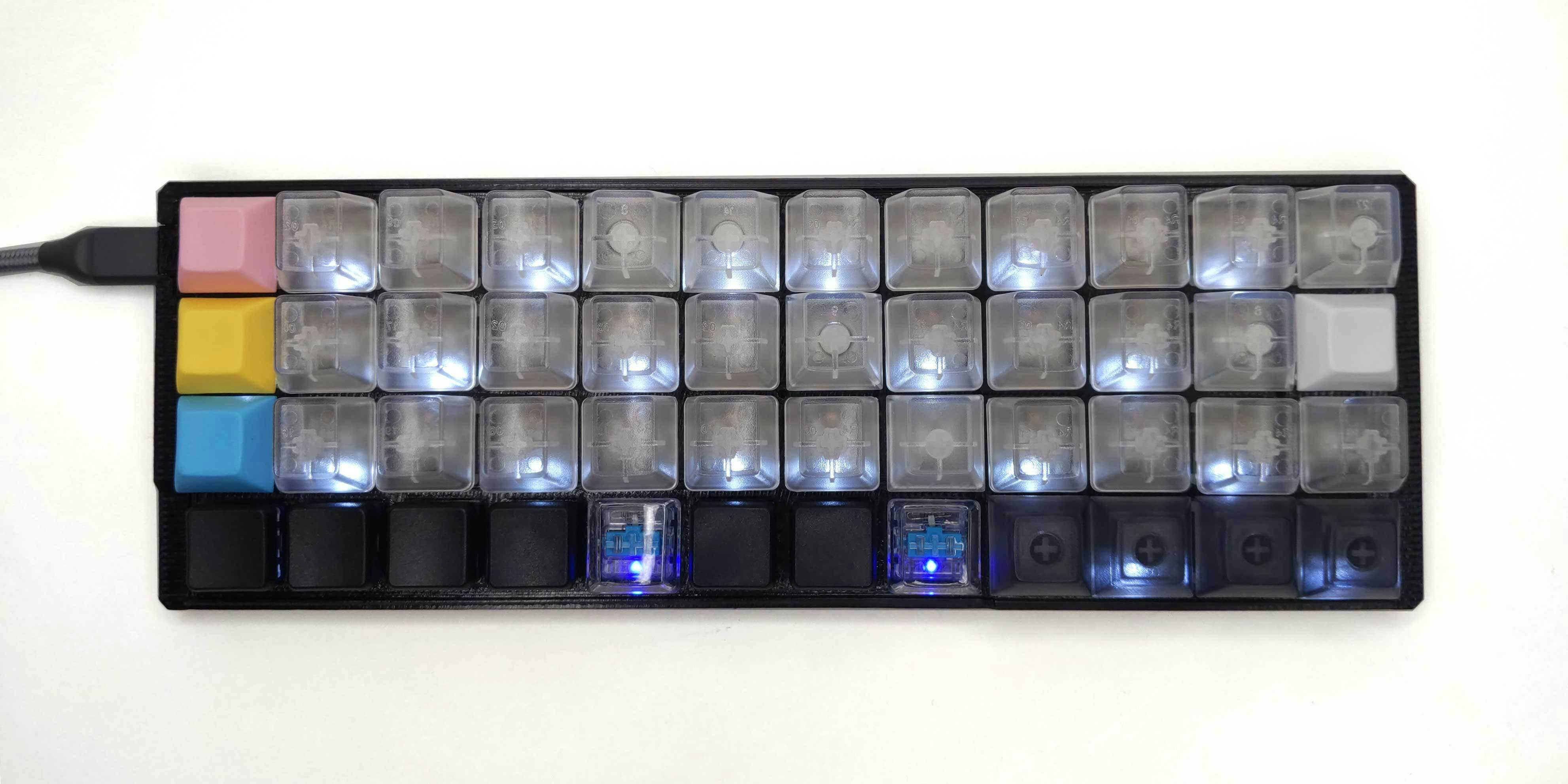 ※ロープロファイルの部分のキースイッチは(青色のキースイッチの部分)はKailh choc blue 押し出し圧25gのリニアキーで固定です。
