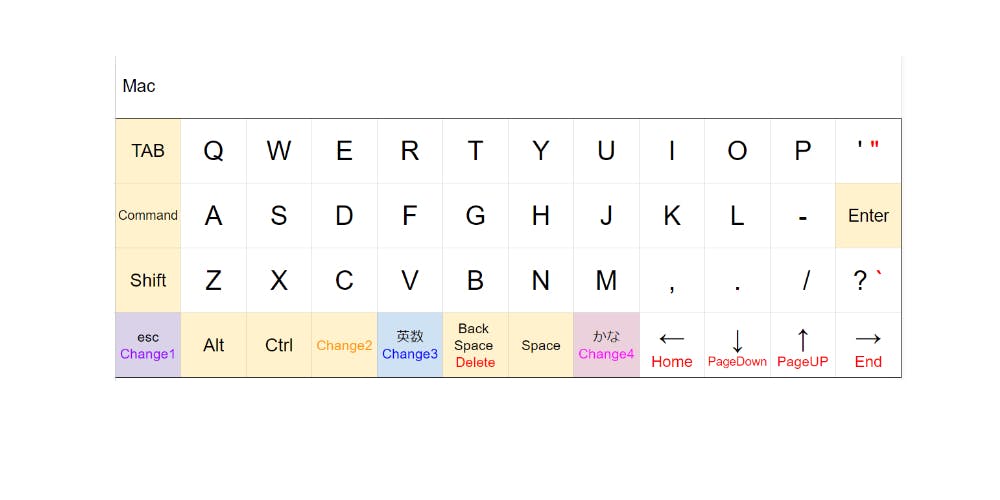 この【Change1】キーを長押ししつつ、右側に配置されたボタンを入力することで、Macだったり、英語キーボードとして認識されます。