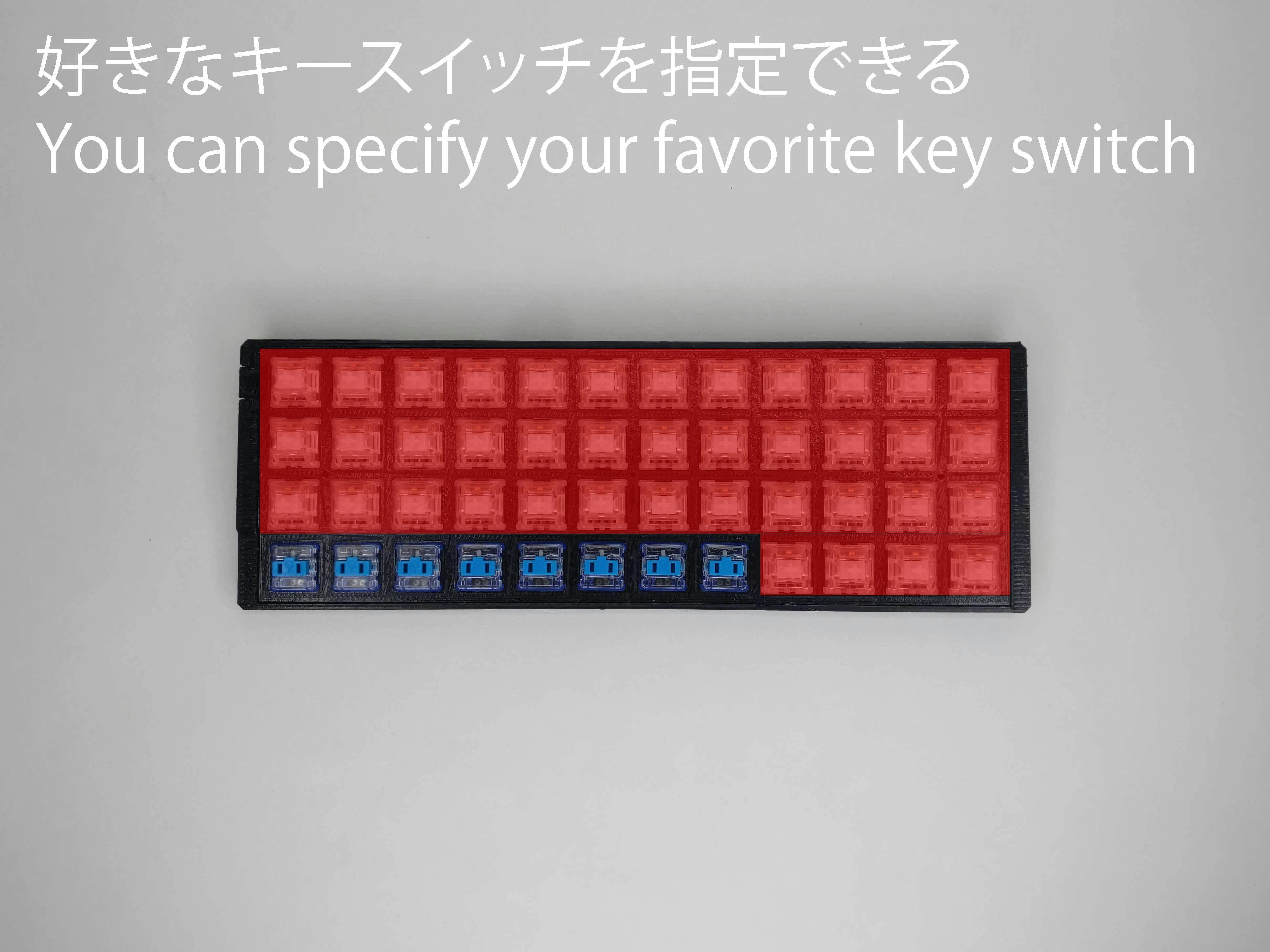 赤く塗られた部分のキースイッチにお好きなメーカーの好きなキースイッチを【一種類】選ぶサービスがございます。チケットを購入したあと、必ず何のキースイッチが良いか教えてください。もしもそのキースイッチを取り寄せることができそうでしたら商品を作成いたします。キースイッチ代金も含まれた最終価格です別途キースイッチ代を請求することはありません。もしもキースイッチを取り寄せられない場合はその旨をお伝えしますので、注文をキャンセルしてください。