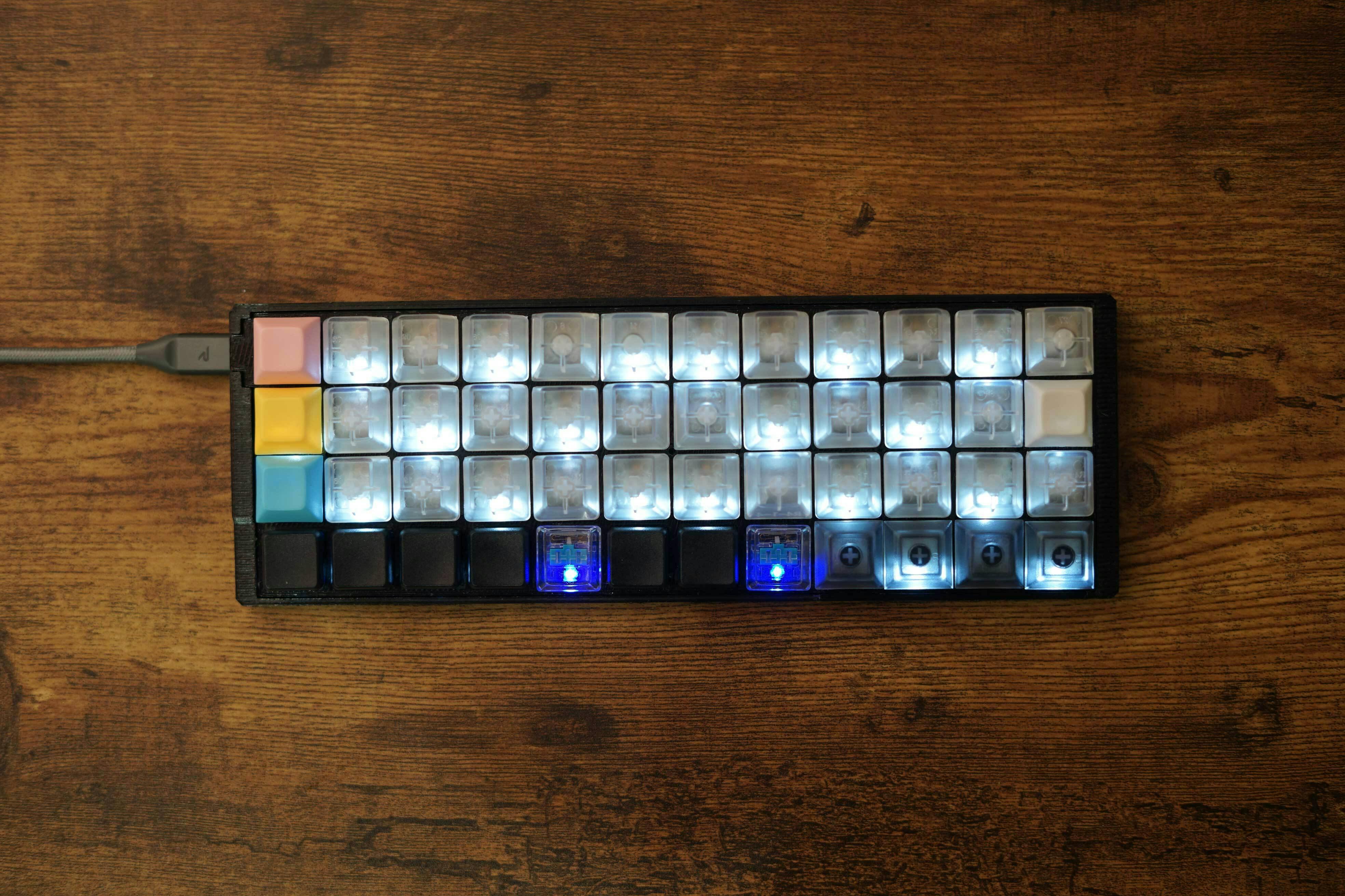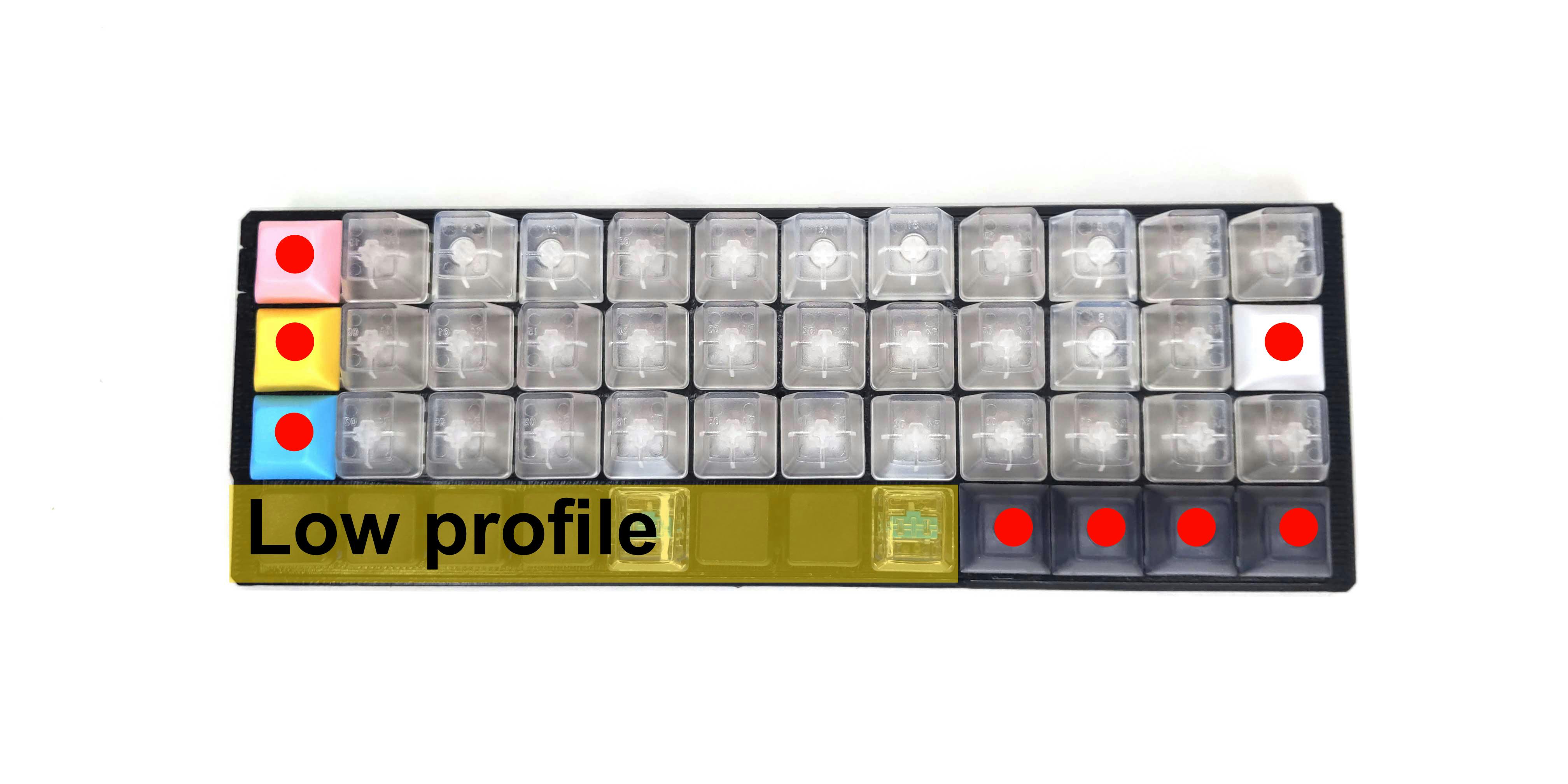 最下段のキースイッチはロープロファイルと呼ばれる薄いタイプのキースイッチを使っております。理由は最下段のキーは主に親指を使って入力するのですが、ロープロファイルのほうが指に対する負担が減るからです。