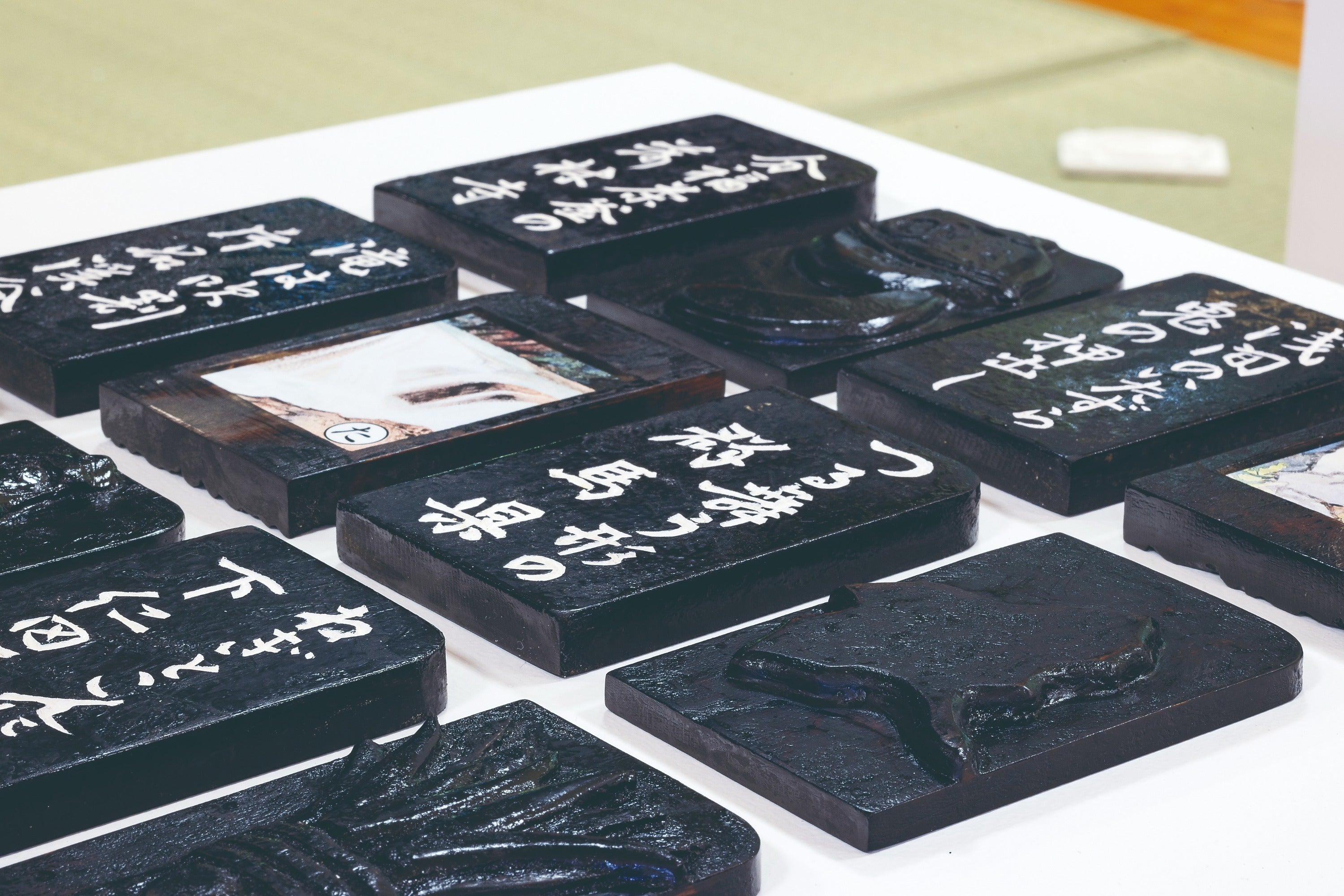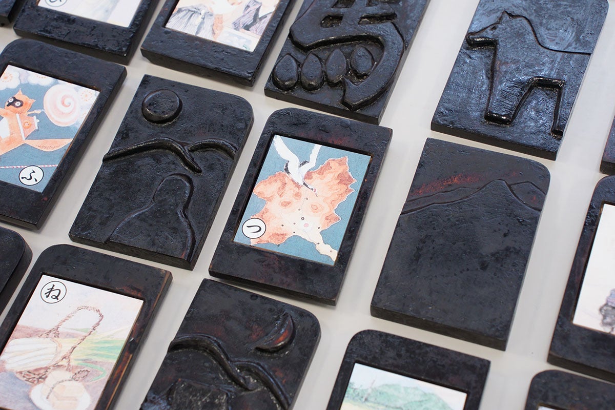 今回のプロジェクトの、「みんなとつながる上毛かるた」は、三輪途道代表が彫刻作品として、手の感覚だけを頼りに44枚の絵札を木の板に貼り付けた粘土で簡略化し、それを三輪代表の彫刻のアシストを長年勤めてきた水口健氏がヒノキの板に刻みました。初版はヒノキに漆がけ(漆がけも三輪代表がやっています)で仕上げ、同様の彫刻による読み札もヒノキの箱に共に納められ、格調の高い美しい芸術作品となっています。