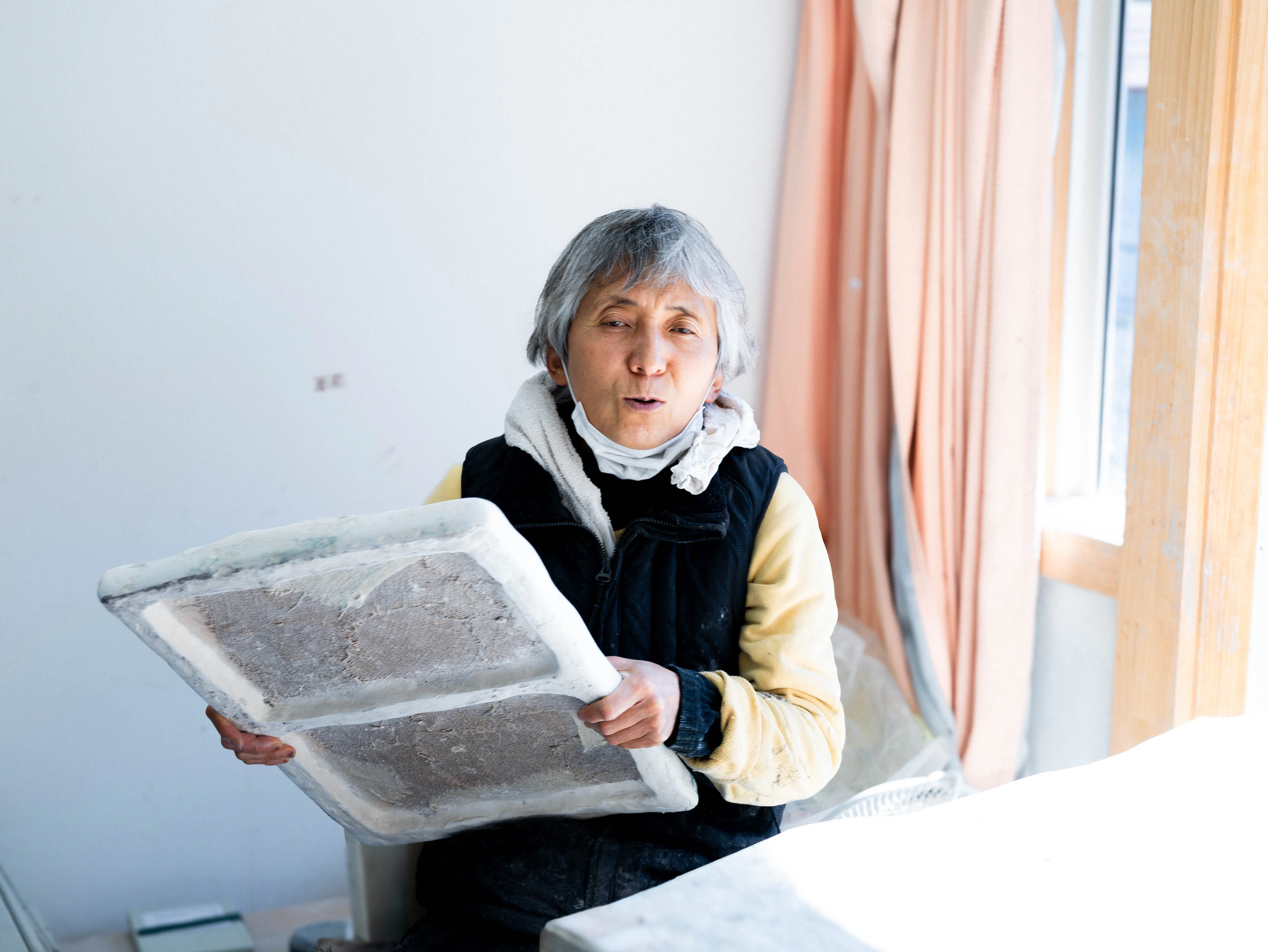 三輪途道代表は、視覚を失う前は日本の具象彫刻の最前線で活躍する彫刻家でした。20年ほど前に網膜色素変性症を発症し、徐々に視覚を失い、現在は全盲の状態です。しかし彼女は創作意欲を失うことなく、触覚だけを頼りに新しい彫刻表現を切り開きつつあります。