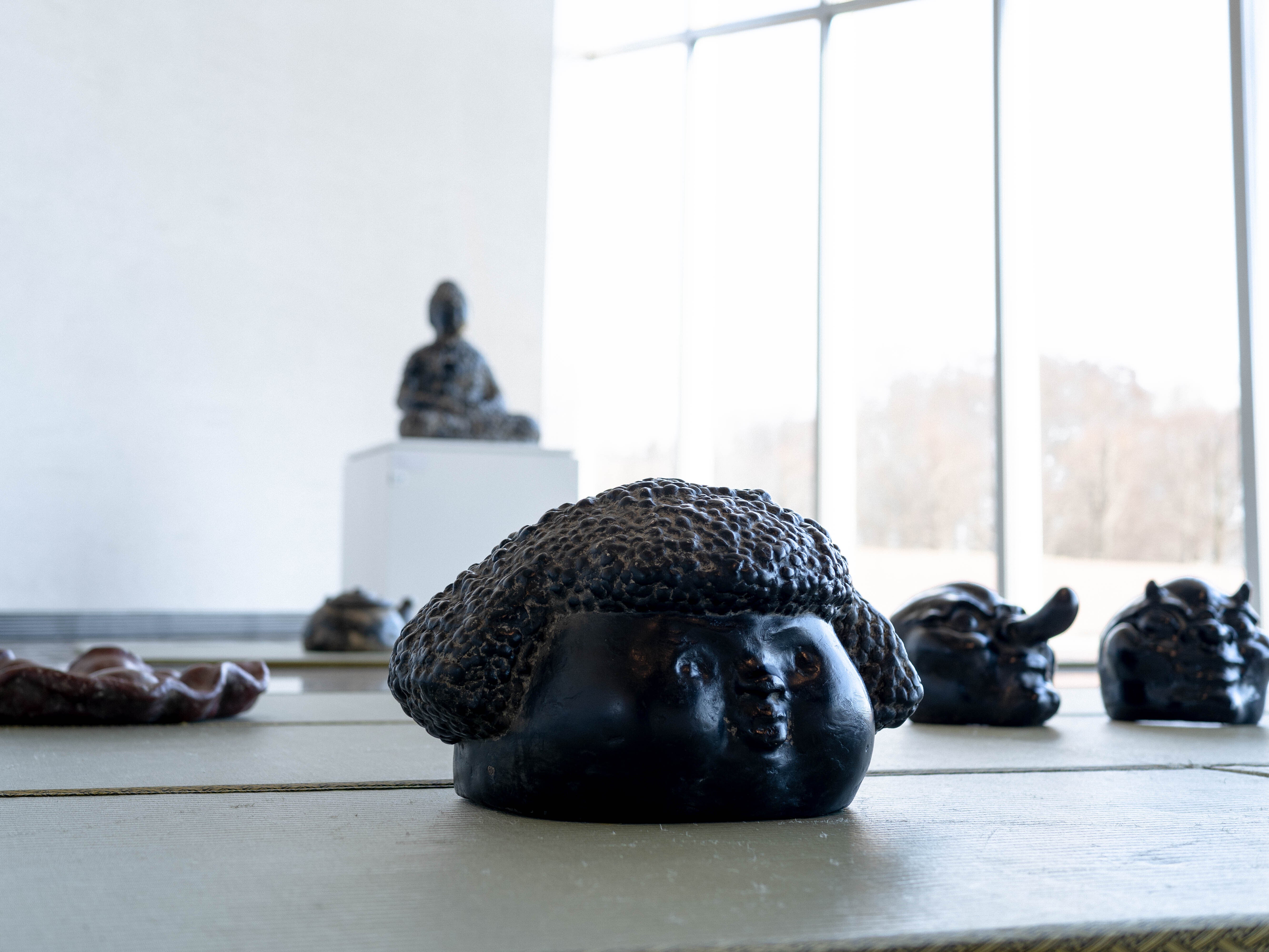 私は現在群馬県立館林美術館でさわれる彫刻展を開催しています。第一展示室という体育館のような大きい空間に畳を80枚しいて作品を30点余り展示しています。これらの作品は私が見えなくなってから作った塑像作品です。見えていた頃の記憶と手の感覚を頼りに、まさに手探りで表現を模索しながら作っています。