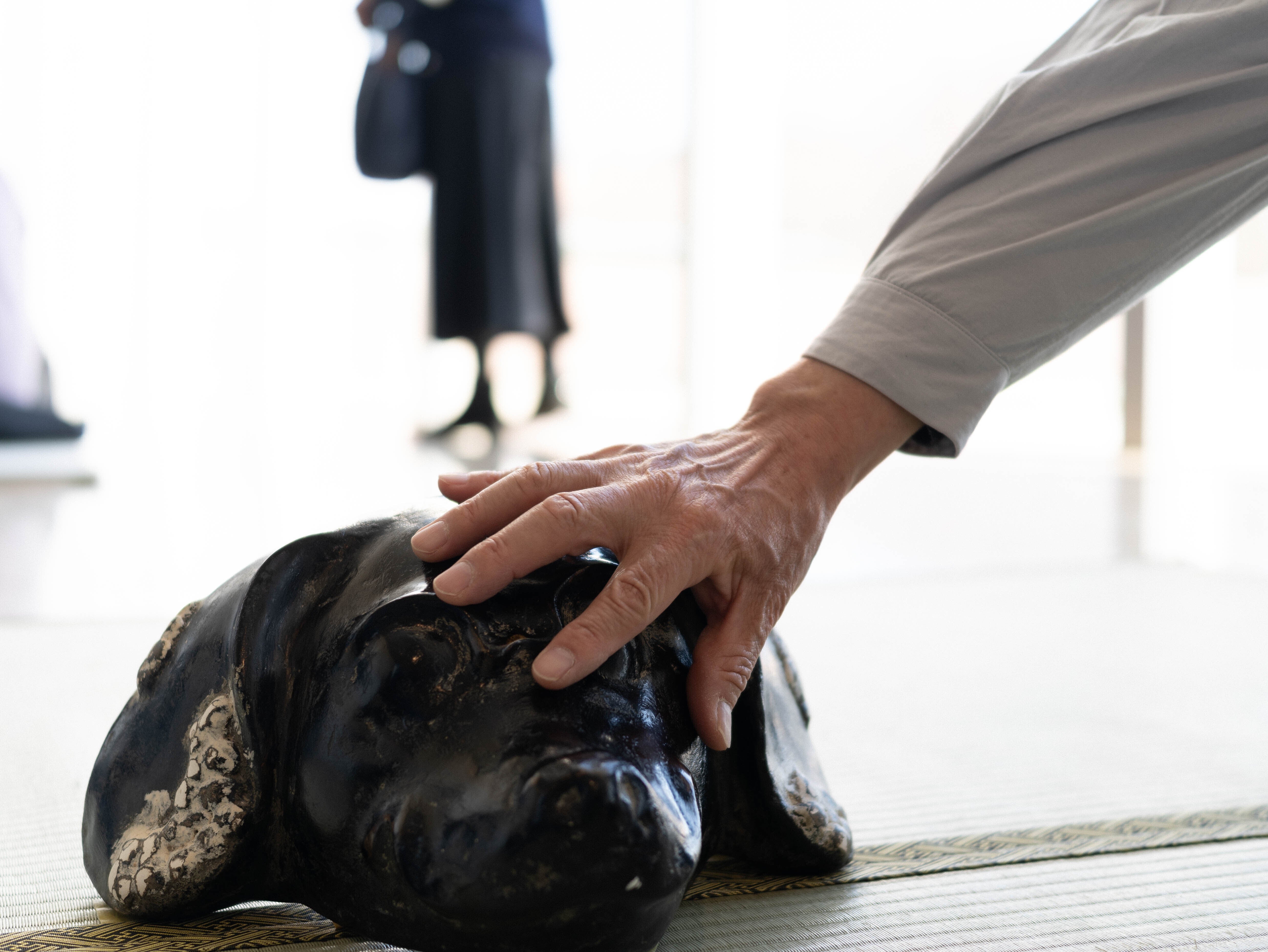 視覚に頼らないでの造形、触覚だけで形を作っていく表現。最初は、とにかく位置をしっかり決めるということが重要だったそうです。長年、緻密な造形をしてきた代表は、ある種の3Dスキャナーのようなものが頭の中にあり、位置さえはっきりわかれば、頭の中に3次元の座標軸を思い浮かべながら、形を作っていくことができるのです。ただ、一旦作業を離れるとどこの部分をやっていたかを見失ってしまうーそこで正方形の台の上で台の寸法を手がかりに位置を把握するようにして、作業をするようになります。その後、ビー玉を埋め込み、それの位置関係で全体を把握するなど、さまざまな技法を重ねていきます。そして、何より手触りの彫刻ならではの、質感や触った時のざらざら感・スベスベ感などを表現として取り入れていきました。