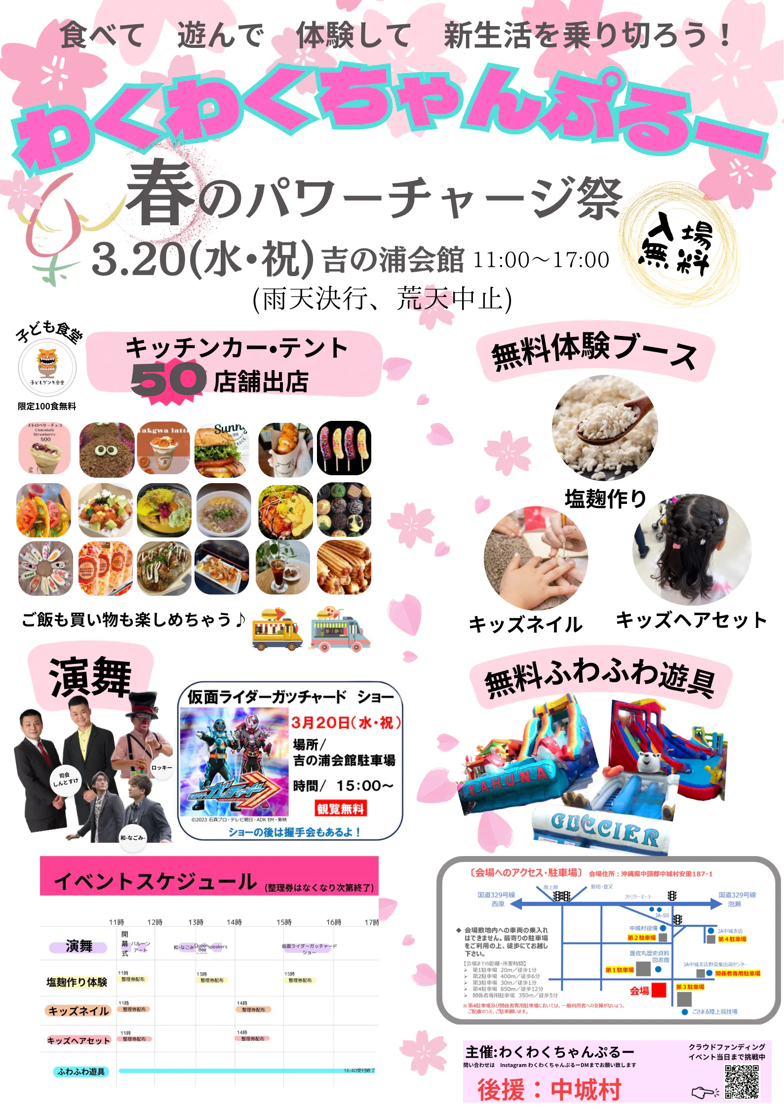 2024/03/08 06:45おはようございます!日々皆様からのご賛同、ご支援、拡散誠に感謝しています。いつもありがとうございます。3/20(水・祝日)第一回 わくわくちゃんぷるー春のパワーチャージ祭のフライヤーが完成致しました!中城村の協賛、後援によるイベントになります。食べて、遊んで、体験して心も体もリフレッシュし新生活を迎えてほしい。そんな気持ちでイベントを開催させて頂きます。イベントではこども食堂による100食無料配布(子ども限定になります)無料ブースは【食育×リフレッシュ】。テーマにした塩麹作り、キッズネイル、キッズヘアセット体験。無理ふわふわ遊具キッチンカー、テント出店合わせて50ブース縁日も盛りだくさん子どもたちや家族連れはもちろん、地域の皆様がたくさん足を運んでくださると嬉しいです。3/20は中城村 吉の浦会館にて皆様にお会いできるのを楽しみにしております。 もっと見る