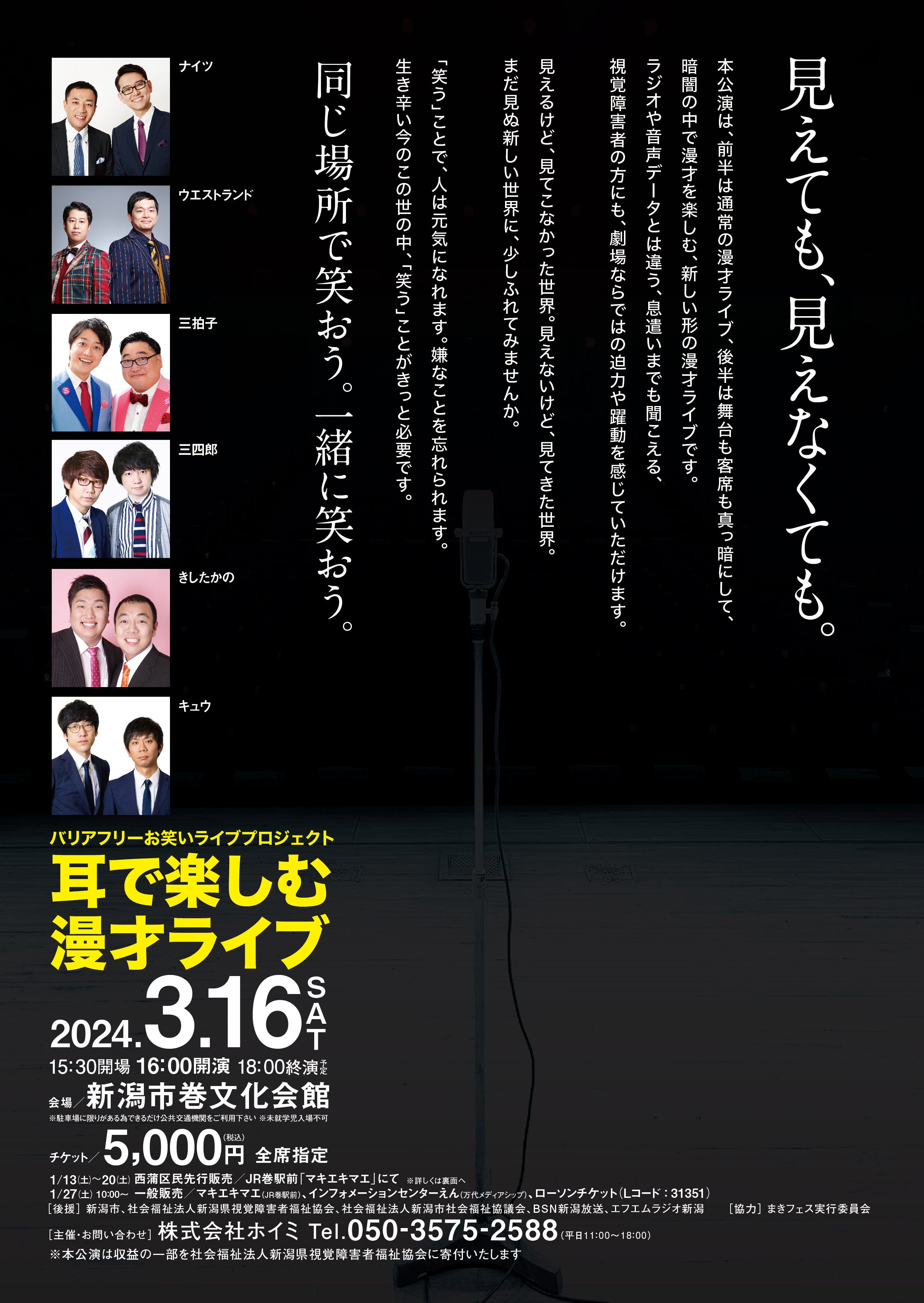 …視覚障害者も健常者も観客全てが同じ環境において漫才を楽しんでいただくという、バリアフリーなお笑いライブであり、 趣旨的にも演出的にもたぶん日本初の漫才ライブです。