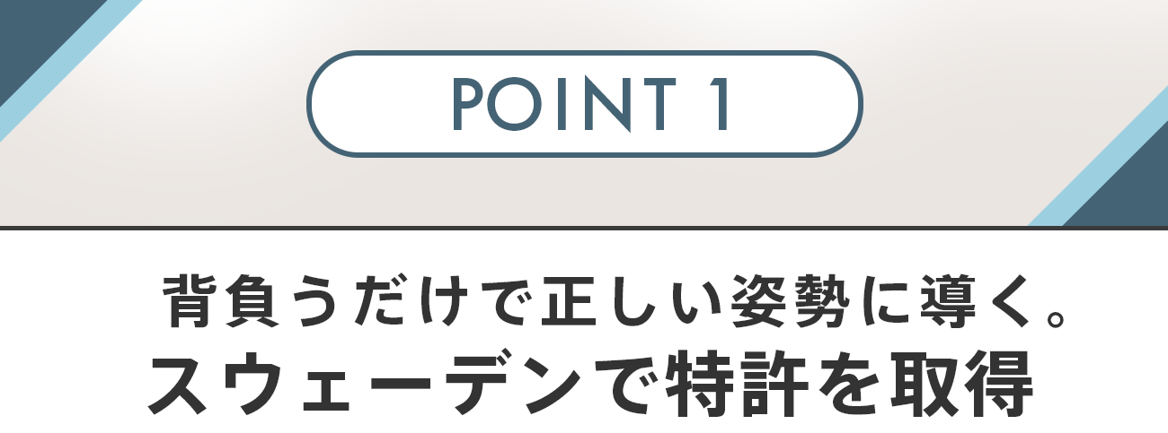 【Vertical Ergonomic Backpack】にはSwedish Posture社が人間工学を基に独自に開発し、スウェーデンで特許を取得した「姿勢垂直システム」を採用しています。