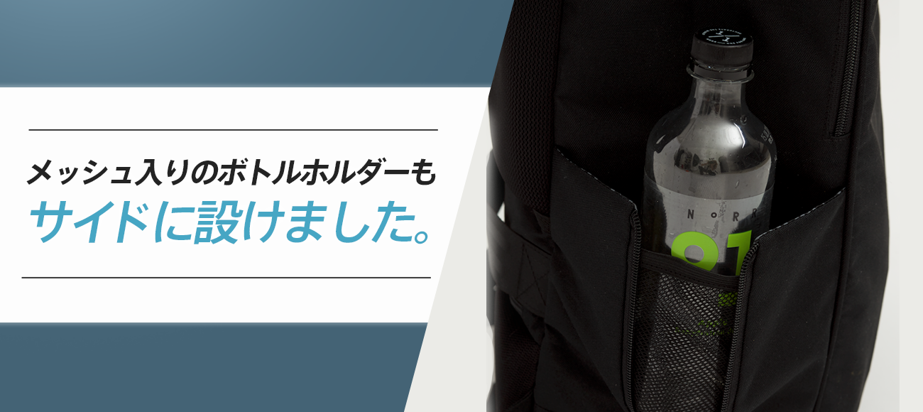 バックパックのサイド部分には飲みかけのペットボトルやマイマグを入れられるメッシュ入りのボトルホルダーもサイドに設けました。