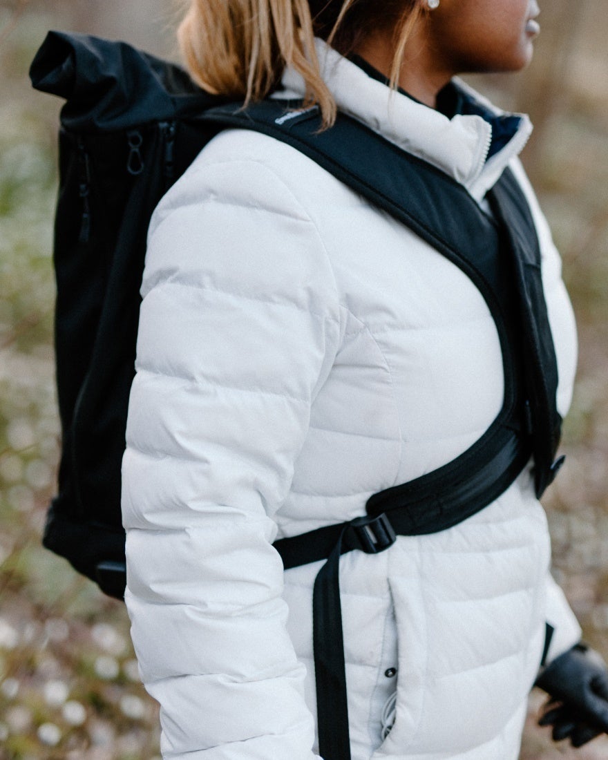 ①【Vertical Ergonomic Backpack】を背負い、ストラップの長さを調整してバックパックを体に密着させます。