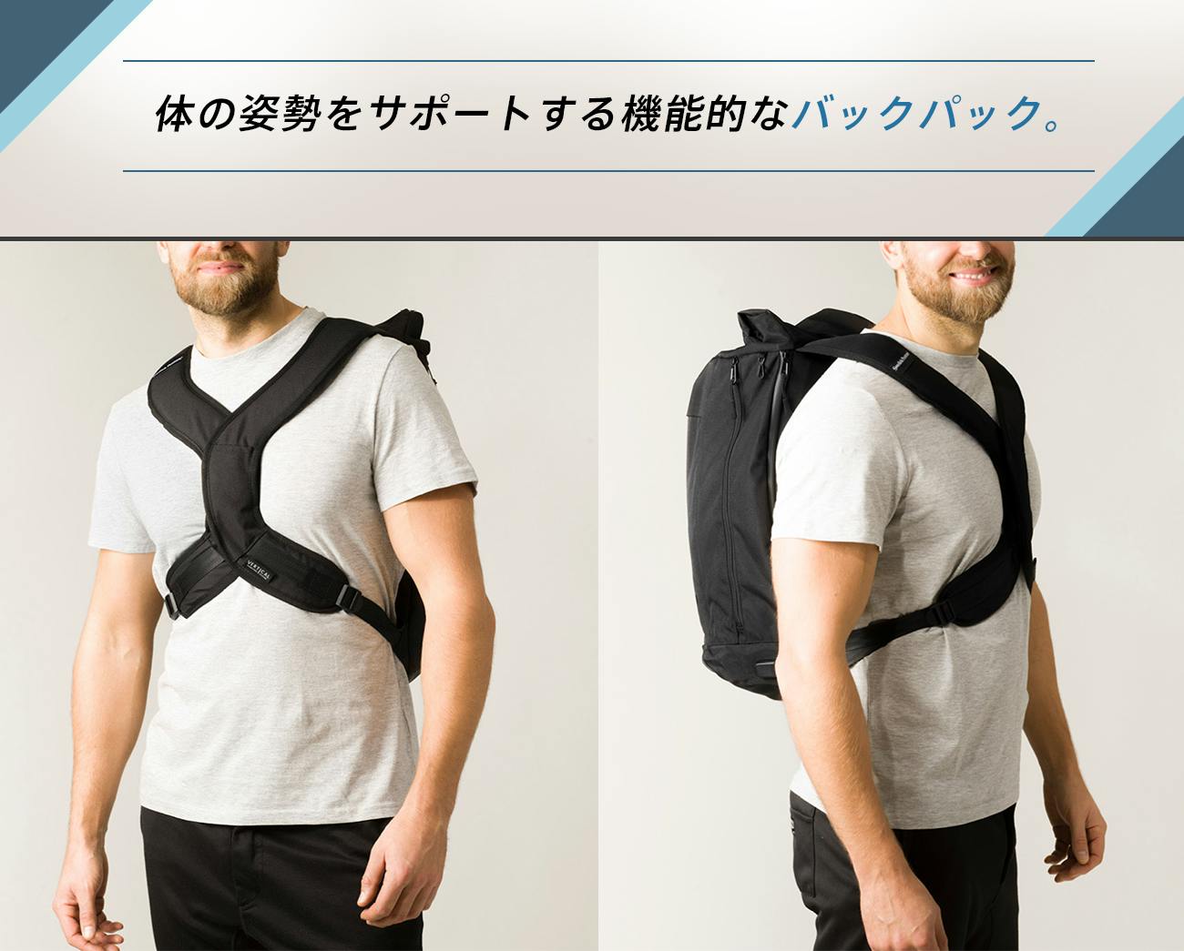 バックパックを背負うだけで体を正しい姿勢に導くと共に、体幹で支えることで肩や腰に掛かる体圧を分散し、驚くほど荷物が軽く感じられる優れもの。