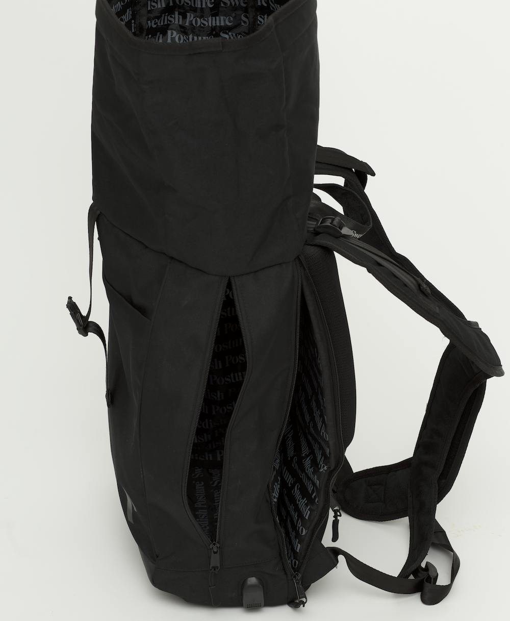 ロールトップは間口をクルクル巻くため荷物の取り出しに時間が掛かるのが難点ですが、【Vertical Ergonomic Backpack】ではロールトップを開かずとも荷物が取り出せるサイドファスナー付き。
