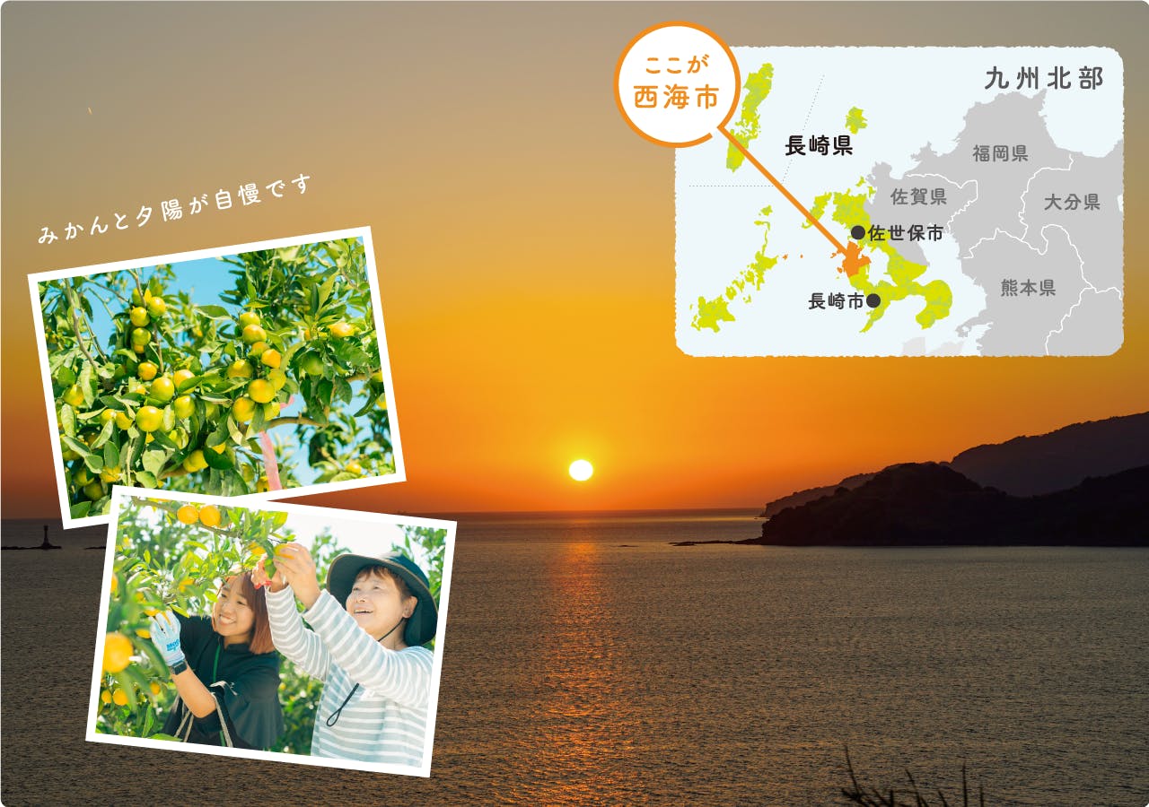 エコヴィレッジさいかい元氣村があるのは、日本の西の端っこ、長崎県西海市(さいかいし)の森の中。山と海とに囲まれた自然豊かな地域で、みかんやびわ、ゆでぼし大根などの名産地。西には五島列島へと続く五島灘が広がり、美しい夕陽が自慢です。