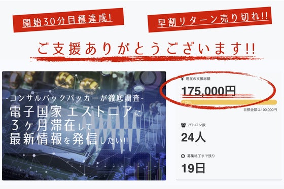 2018/04/21 18:16▼目標達成の御礼 みなさんこんにちは。改めまして、コンサルバックパッカーのAlexです。 先日リリースさせていただいた本プロジェクトですが、開始30分で目標達成(!)・そして早割リターン売り切れ(!!!)という大変嬉しい結果となりました。 ご支援いただいた皆さま、本当にありがとうございます。リターンの方は準備ができ次第、順次ご案内させていただきますので、お楽しみにお待ちいただければ幸いです。 ▼追加リターン公開決定! そして、大変有り難いことにたくさんのご要望の声をいただいて、追加リターンを設定させていただくことになりました。内容としましては、現在公開しているリターンと同様のものをご用意する予定です。ご支援を検討されていたのに、売り切れて買えなかったという皆様、お待たせしてしまい申し訳ありません。 現在追加リターンの内容をCAMPFIREの運営チームに審査申請中ですので、承認をいただき次第の公開となります。(週明け月曜日以降の予定です) 大変恐縮ですが、今しばらくお待ちいただければ幸いです。 ※コミュニテイを構築する関係上、規模が大きくなると管理しきれなくなってしまうため、今回もリターン数を限定させていただきます。完売する可能性もあるため、ご検討中の方は早めにご購入いただければ幸いです。※追加リターンでは、早割リターンから料金を改定させていただきます。予めご了承ください。 ▼追加リターン資金の使いみち なお追加で支援いただいた資金は、以下の用途に充当する予定です。 ・3ヶ月間の滞在に伴って発生する家賃、食費、交通費、航空券代・ライターへの人件費・リサーチアシスタントへの人件費 より充実した発信をするために、ライターやリサーチアシスタントを迎えたプロジェクトチームを組成し、短スパンで質の高い情報をアウトプットしていきたいと思っています。 引き続きのご支援、宜しくお願いします! もっと見る