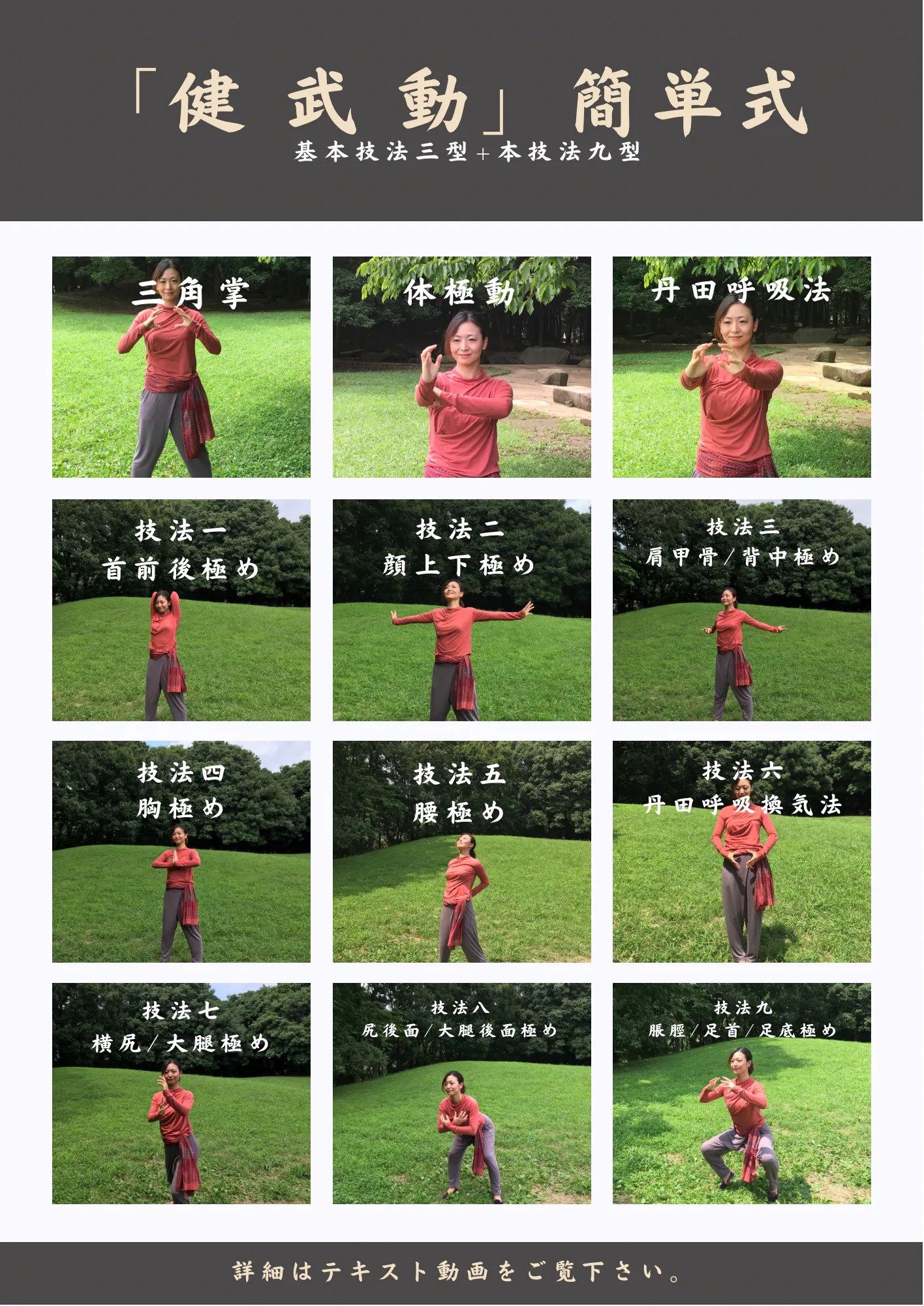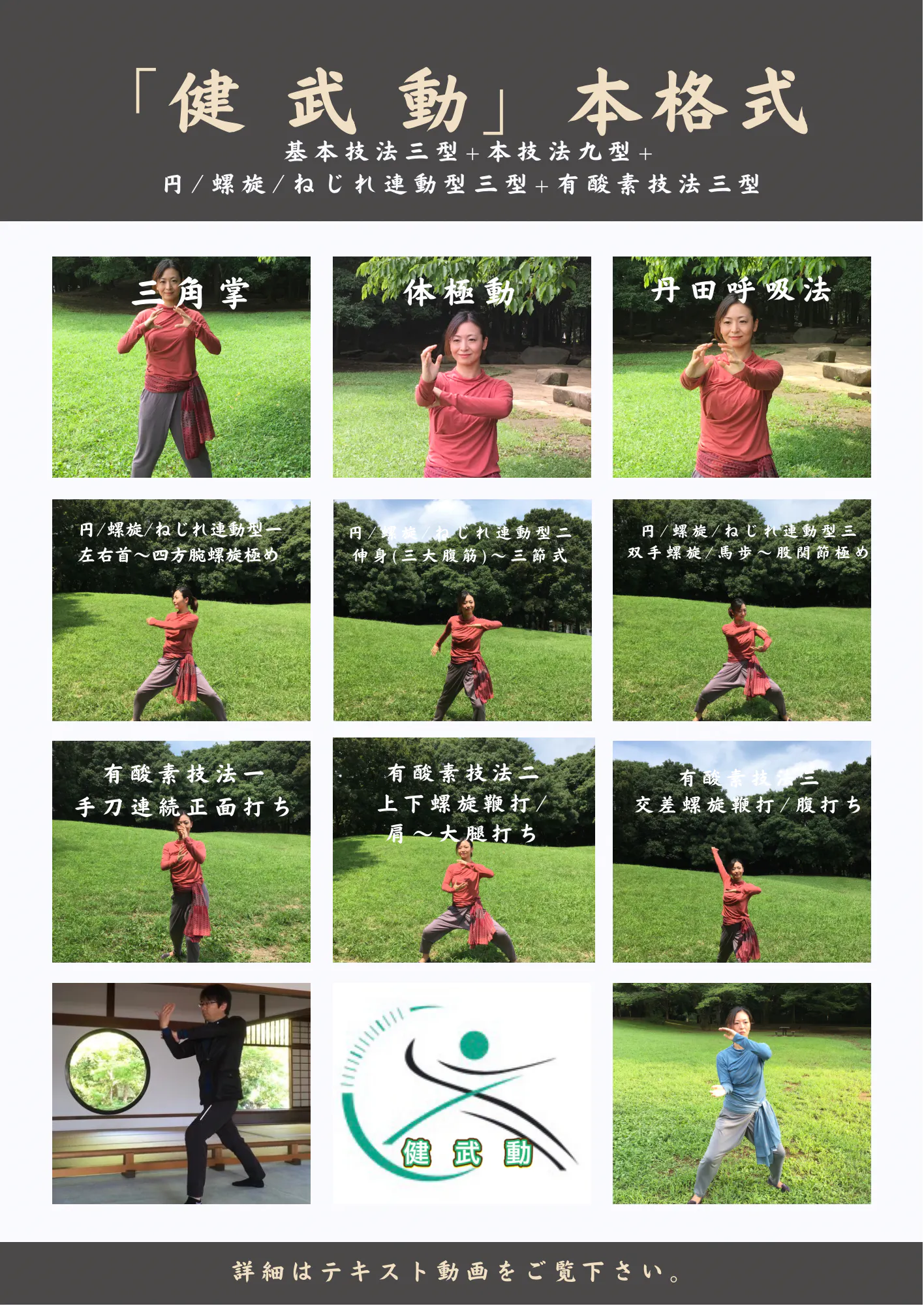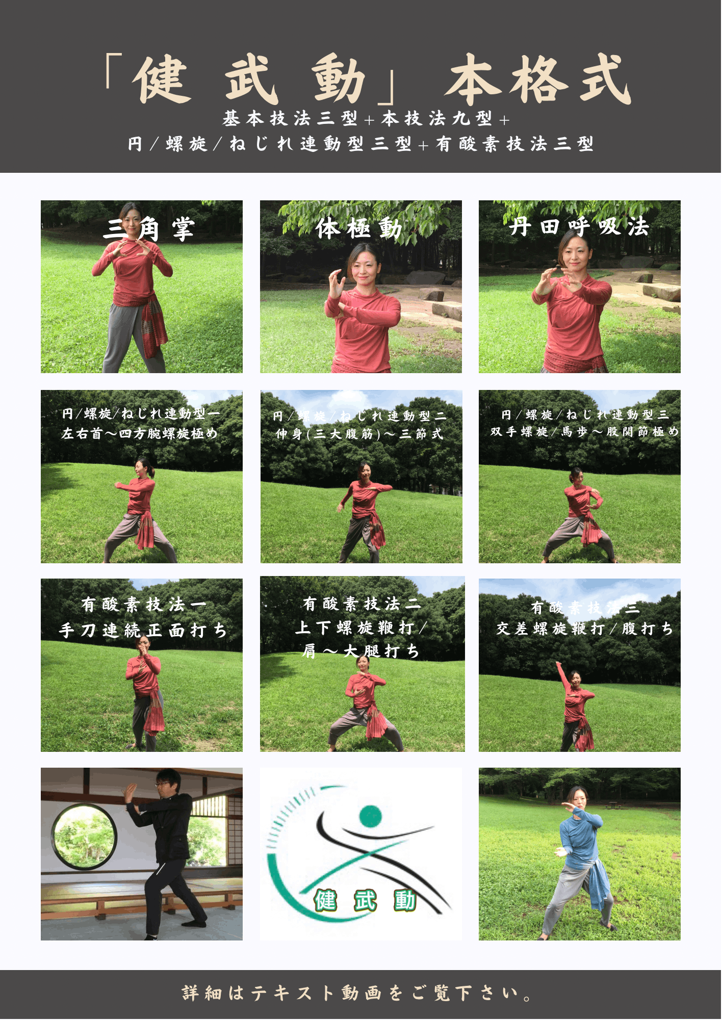 体幹 整体操「健 武 動」簡単式は3つの基本技法を元にした「体極動」と「丹田呼吸法」を使い、体の部位毎に首から足底まで流れるようなゆったりとした動きで13個の型を行なっていきます。
