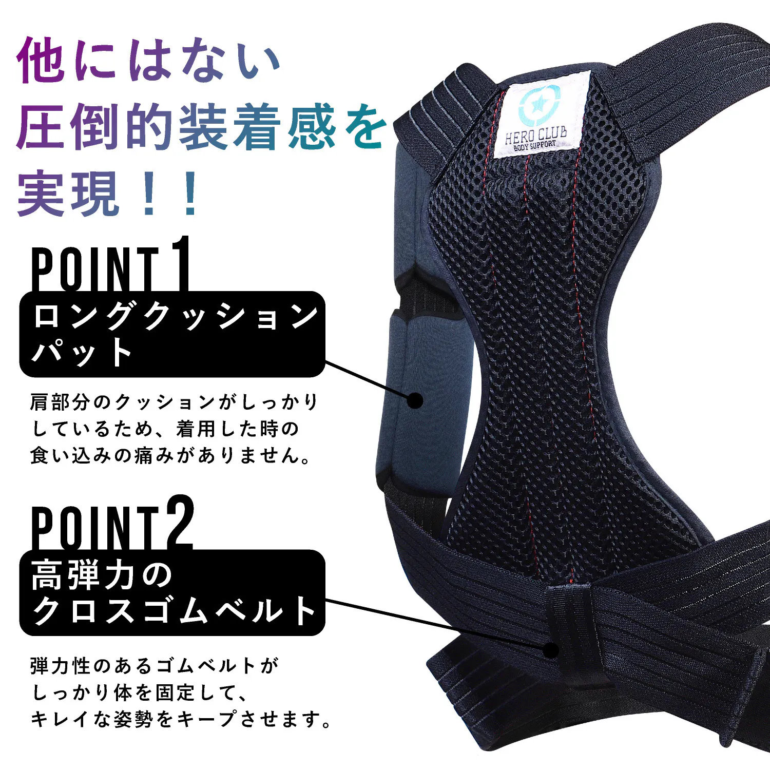 肩や脇への負担がないロングクッションパッド、Wの補正ボーン(支柱)、スパンデックス(伸縮性、耐久性に優れたポリウレタン弾性繊維)を使用した、高弾力のクロスゴムベルトにて体をしっかりサポート。他商品にはない圧倒的な装着感、商品力を実現して、つけ心地、補正力が他商品とはまるで違うとの評価、レビューをいただいております。