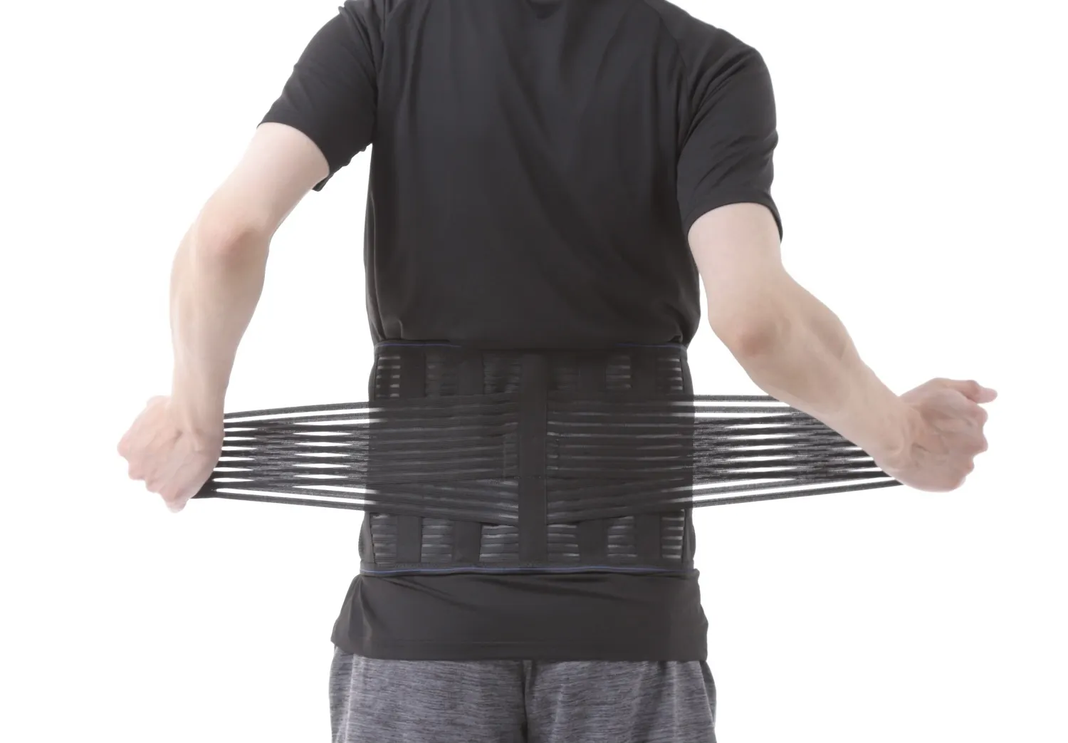 メインベルトでしっかり位置を決めて、スパンデックス(伸縮性、耐久性に優れたポリウレタン弾性繊維)を使ったV字補助ベルトで腰回りを均等に加圧するWベルト構造でしっかり腰回りをサポートします。