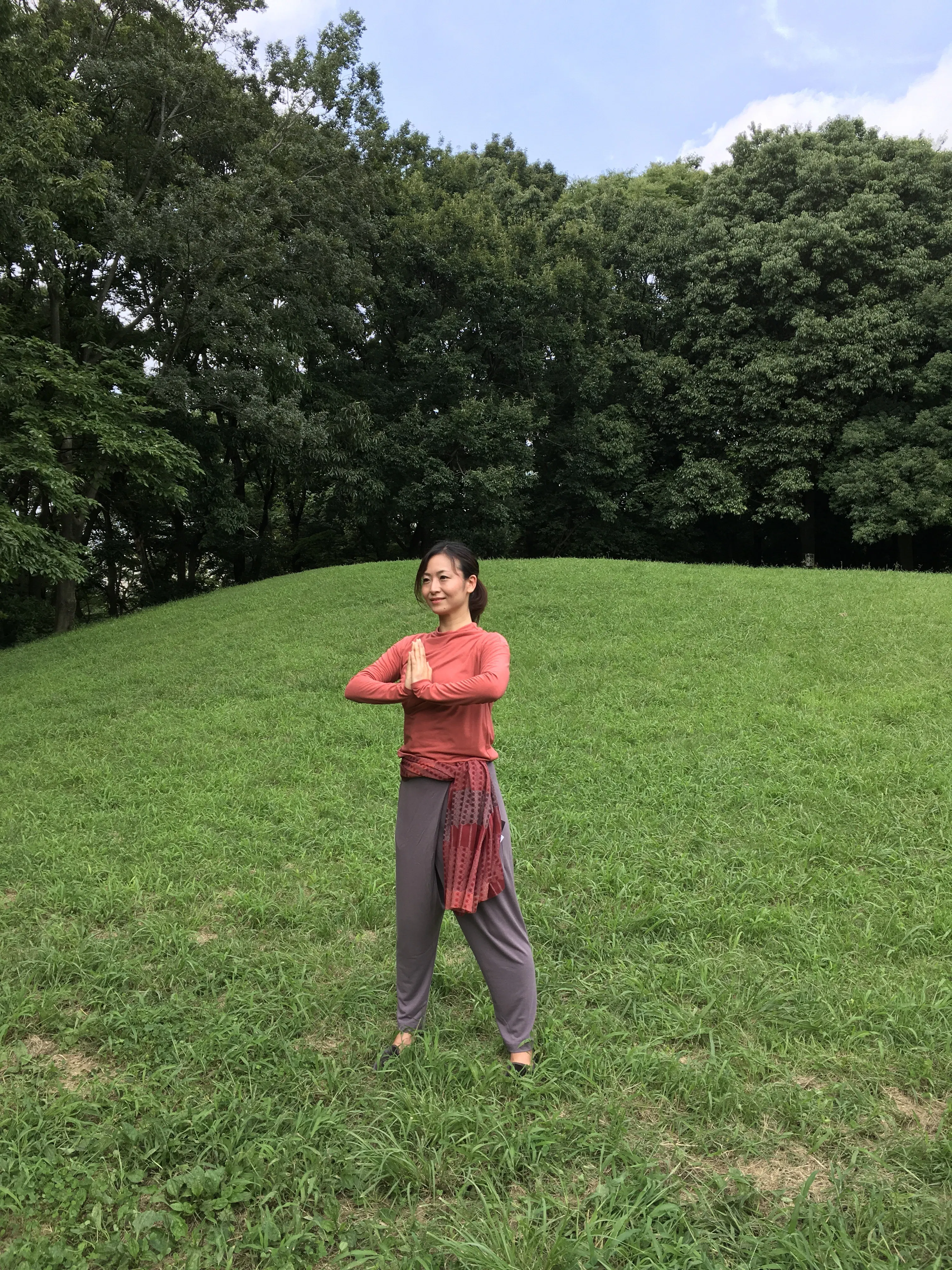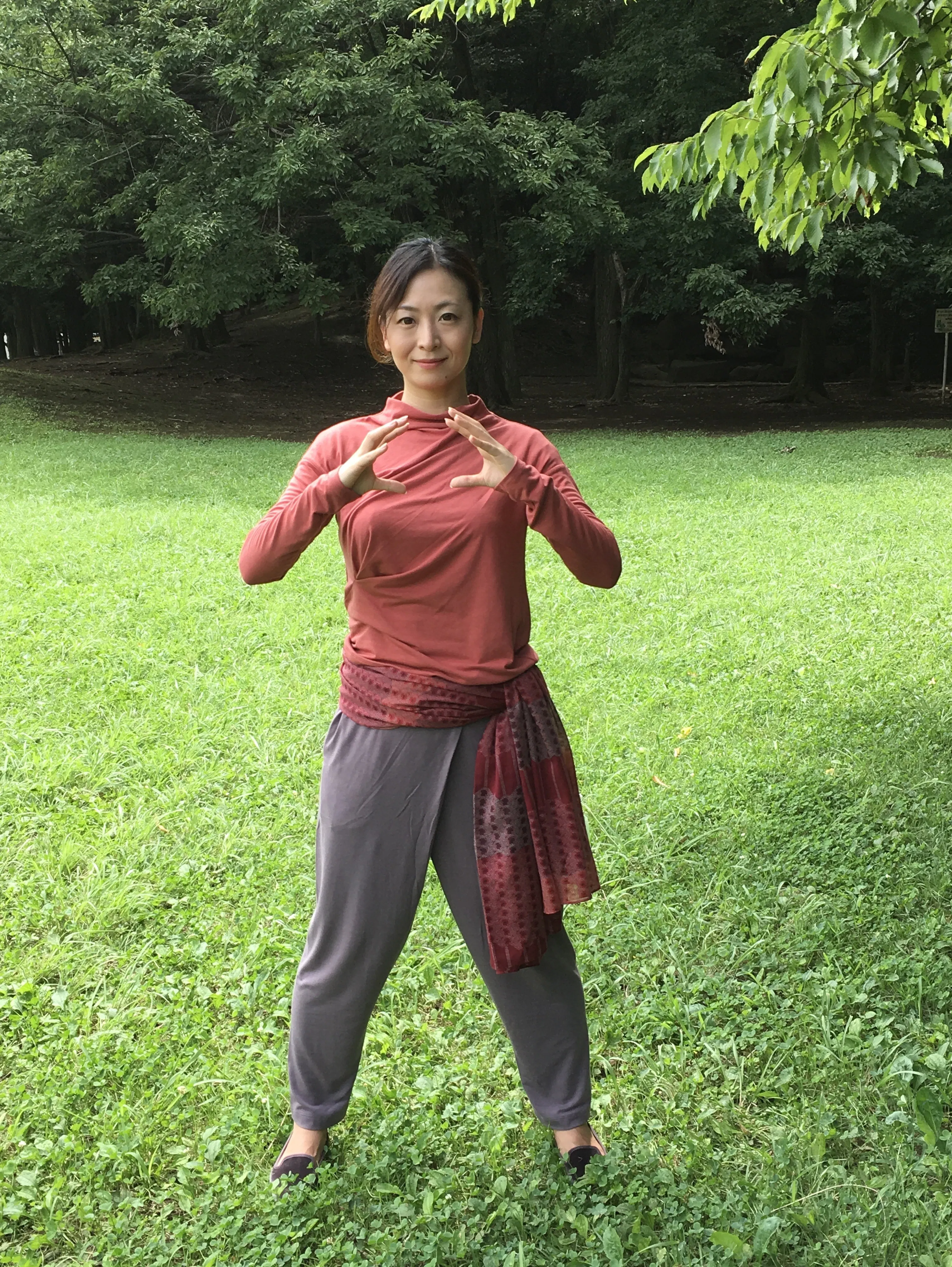 基本技法❶三角掌〜両手で胸の前で三角の形を作り、型と型の間に行う息継ぎの休呼吸です。