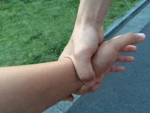 基本技法❷手首極め〜合気柔術で相手に手を掴まれた際に使う技法。これを「健 武 動」に応用し指先から逆に体の方向へ力が伝わるようにして、指先を張り掌はボールを掴むようにして指先を真っ直ぐに伸ばします。型を行う際には必ずこの形を作りながら動作を行います。