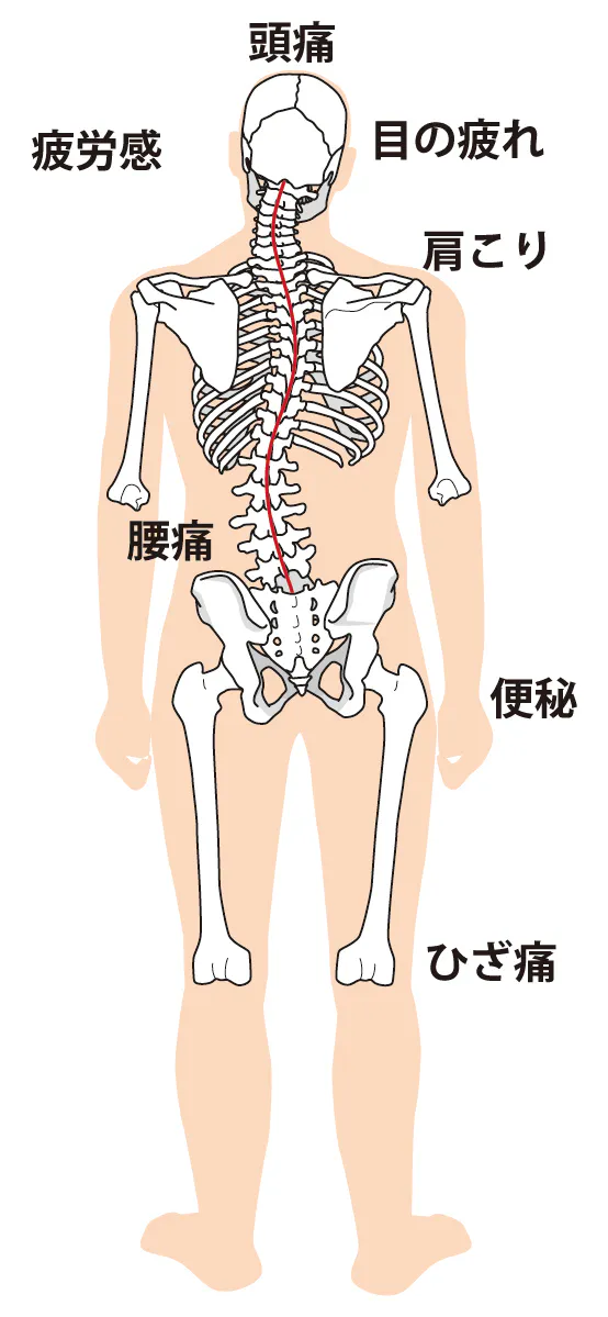 これが続くと体幹部(首、肩、肩甲骨、背中、腰、骨盤)の疲れが蓄積して、各部に血行不良を引き起こし神経の圧迫が起こり、体幹の痛みだけでなく内臓への影響も出てきます。
