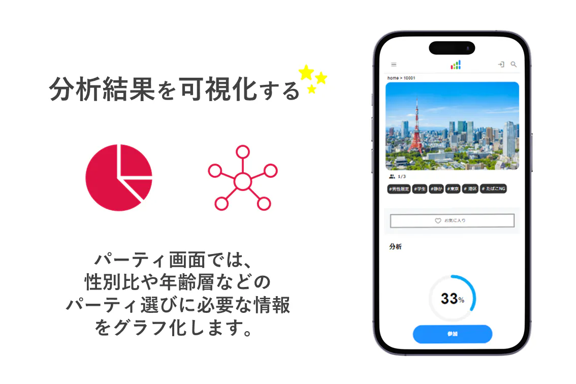 SumaiShareは、パーティを自動で振り分けするだけでなく、各パーティのタグや分析データ(性別比や年齢層など)をみて、任意のパーティに参加することもできます。