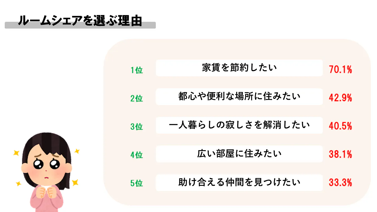 しかしまだまだ課題も多く残されています。日本国内でルームシェアをしたいと思っても掲示板ほどしかないのが現状です。