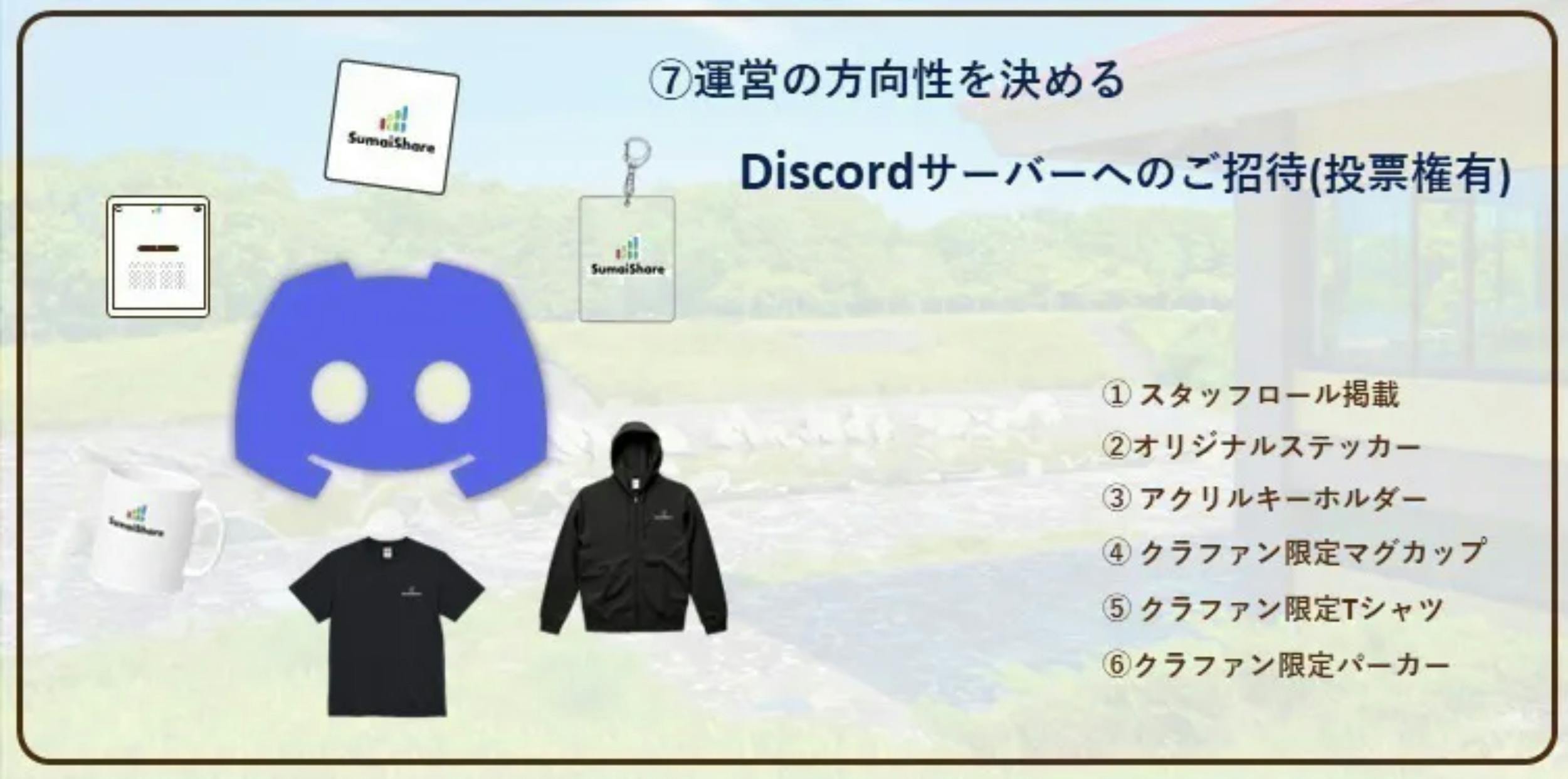 2024/02/22 10:00ご支援者様・ページの訪問者様、ご興味を持っていただき、ありがとうございます。SumaiShareチームの開発担当の井上です。本日は、⑦のリターン紹介をさせていただきます。このリターンは、リターン①〜⑥に、SumaiShareの運営方針を決定するDiscordへの招待を加えたプランです。SumaiShareは、当クラファンプロジェクトの他に、TikTokやYouTubeショートへの投稿、Webアプリの運営(3月中リリース予定)を行っております。SumaiShareのDiscordサーバーは、それらの活動の会議に活用されています。今後の会議では、投票によって、方針を決定する箇所を設ける予定です。当リターンでは、投票権(ロール付与)も含めてDiscordサーバーへの招待をさせていただきます。※リターン⑦については、リターン①〜⑥の発送に合わせて、招待リンクのご連絡をさせていただきます。SumaiShareチームは、当プロジェクトをもっと多くの人に知っていただきたいと考えております。ご興味がある方、ぜひご支援お願い致します。https://camp-fire.jp/projects/view/734953良ければ、FacebookやTwitter等のSNSでのシェア・拡散をお願い致します。#SumaiShareどうぞよろしくお願い致します。SumaiShareチーム もっと見る
