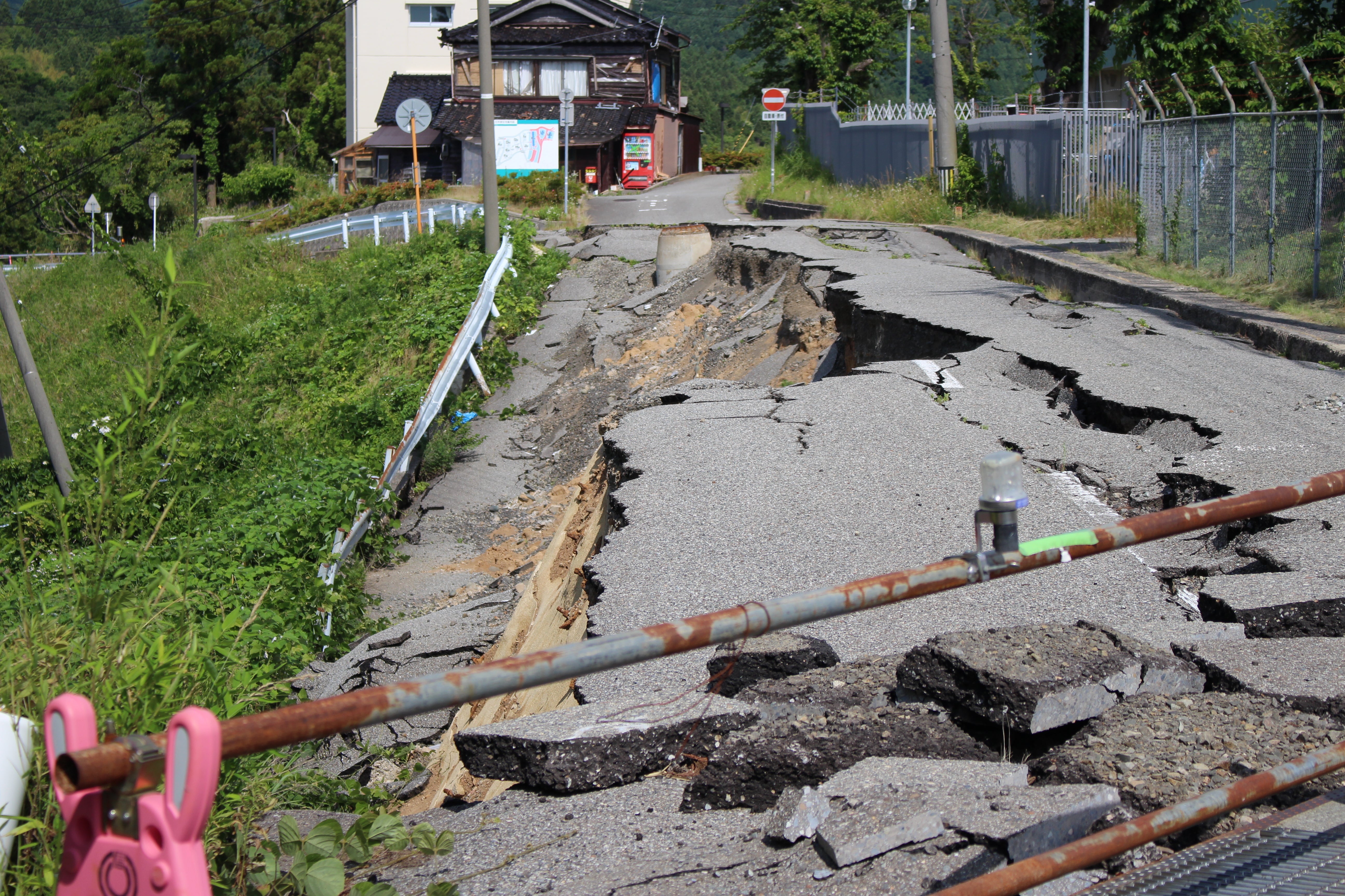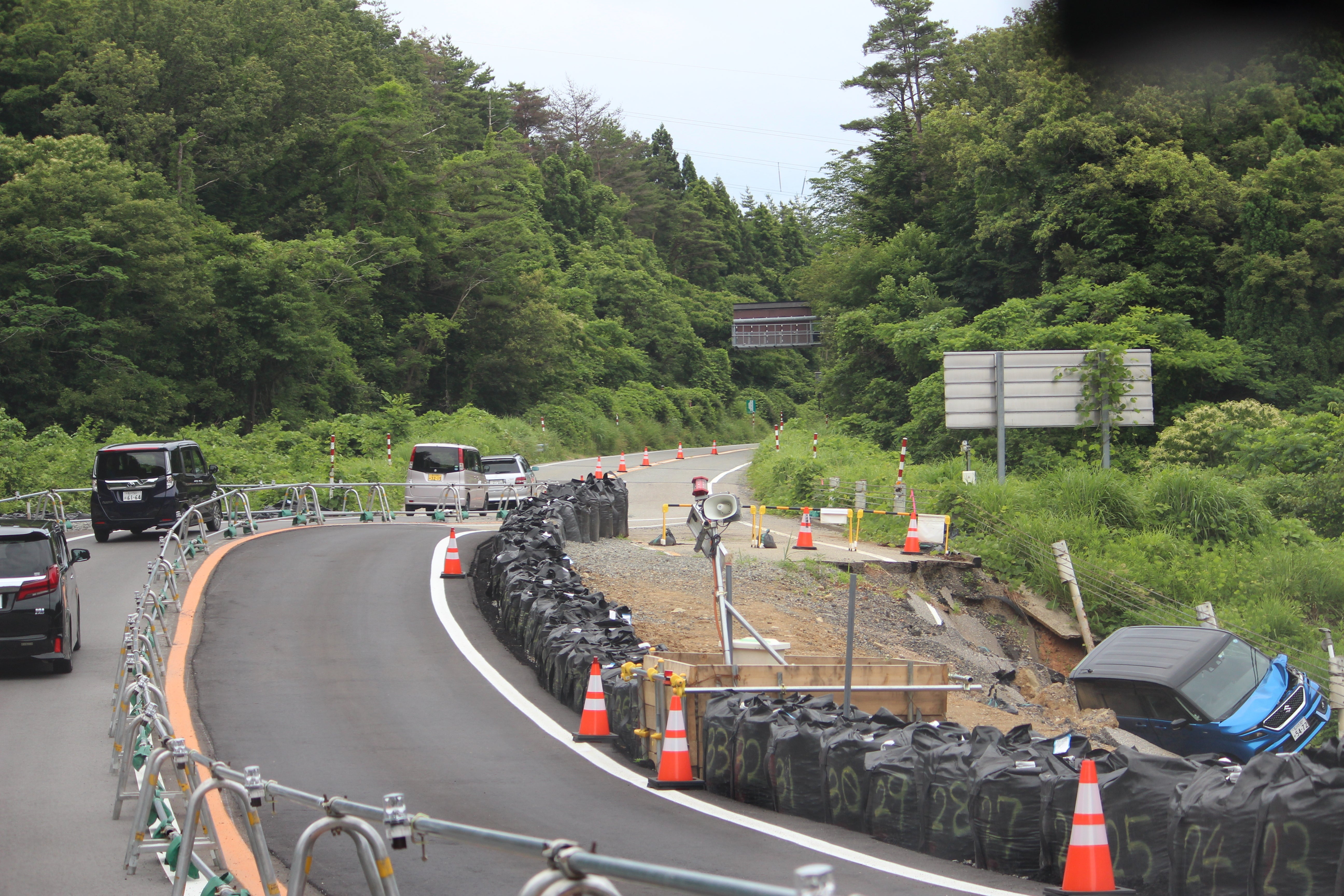 反対車線側では多くの作業員が道路の修繕や、山崩れの防止作業を行っていました。写真では分かりませんが、隆起と陥没があちこちで起こっており、道路はうねっています。それでも作業が進む中、次第に平坦な道も増えているとのことでした。