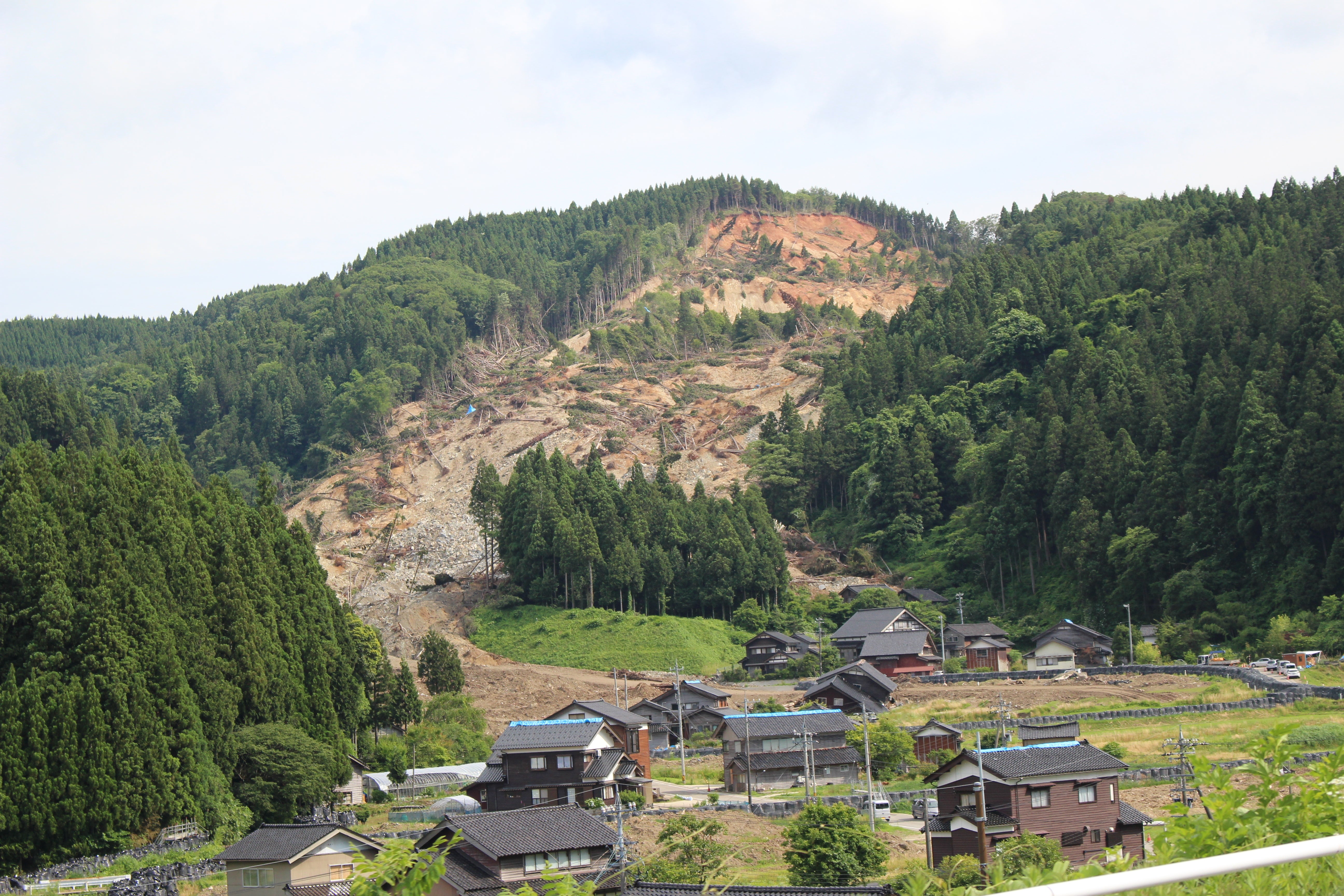 山肌は剥き出しになり、土砂になぎ倒された木々が横倒しになっています。