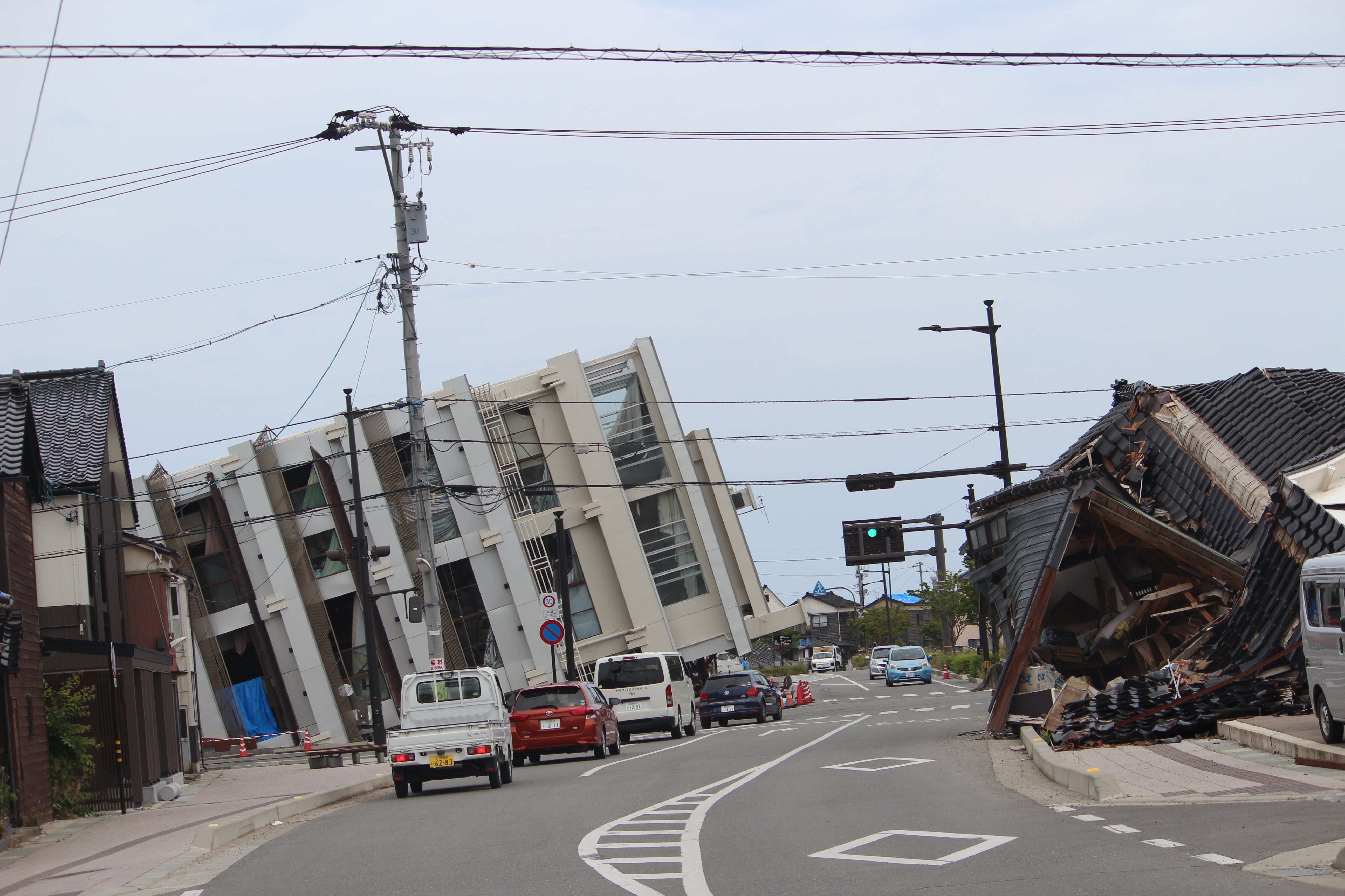 地盤の液状化によって電柱が沈み、信号機が手の届きそうな定位置にありました。運良く、連なった電柱達が一斉に沈んだので、電線は切れずに停電も起こらなかったそうです。